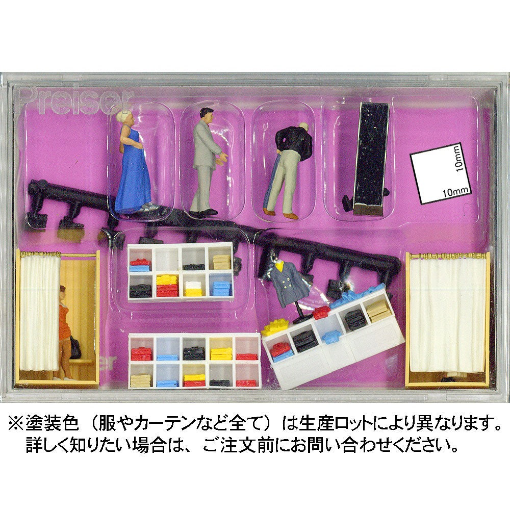This is a set of shoppers and shopkeepers in a clothing shop.