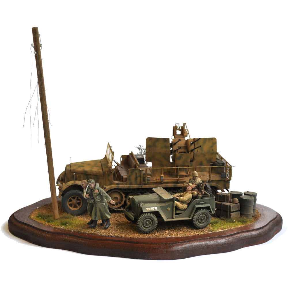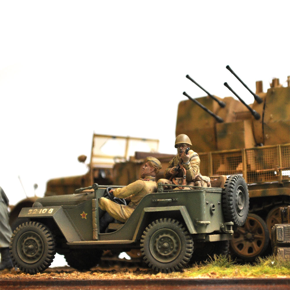 The Russian GAZ jeep is a vignette-sized small diorama made from a Tamiya kit. The figures were modified (some scratch) from a resin kit. The grass is made of miniature nature.