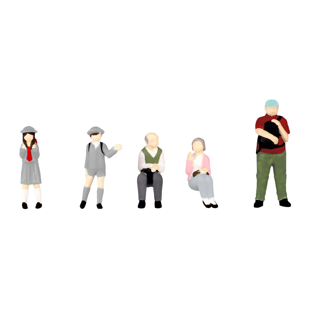 El "Set 2 de la parada de autobús de ese día" incluye cinco muñecos: un anciano sentado, una anciana sentada, un colegial, una colegiala y un hombre bien vestido.