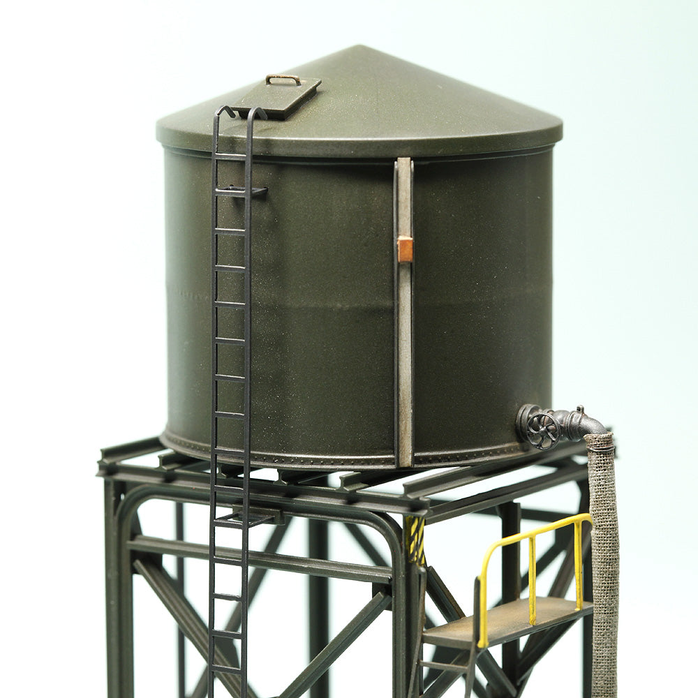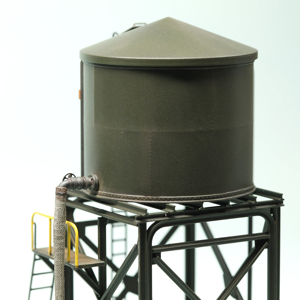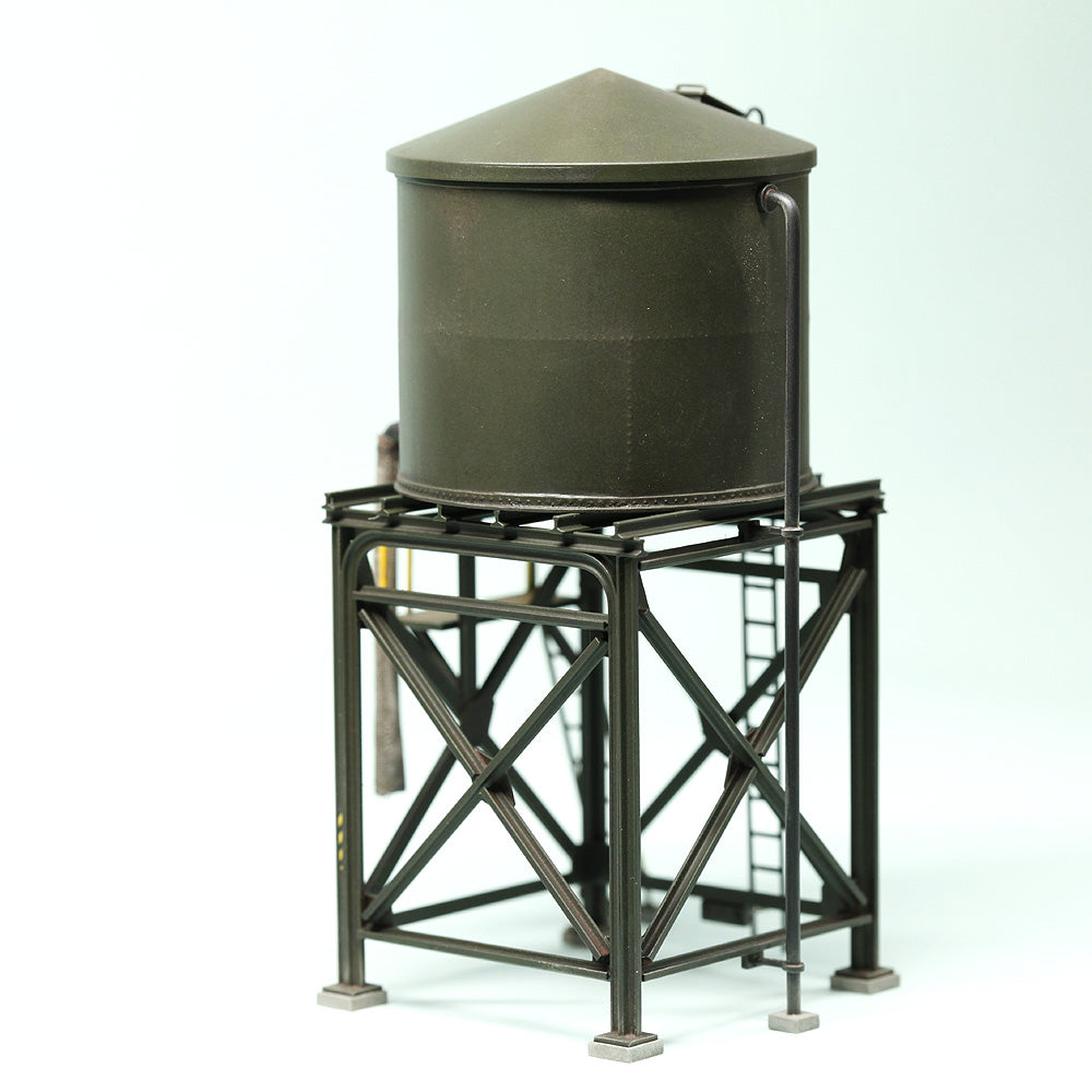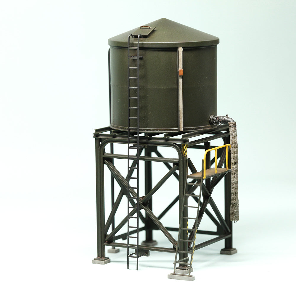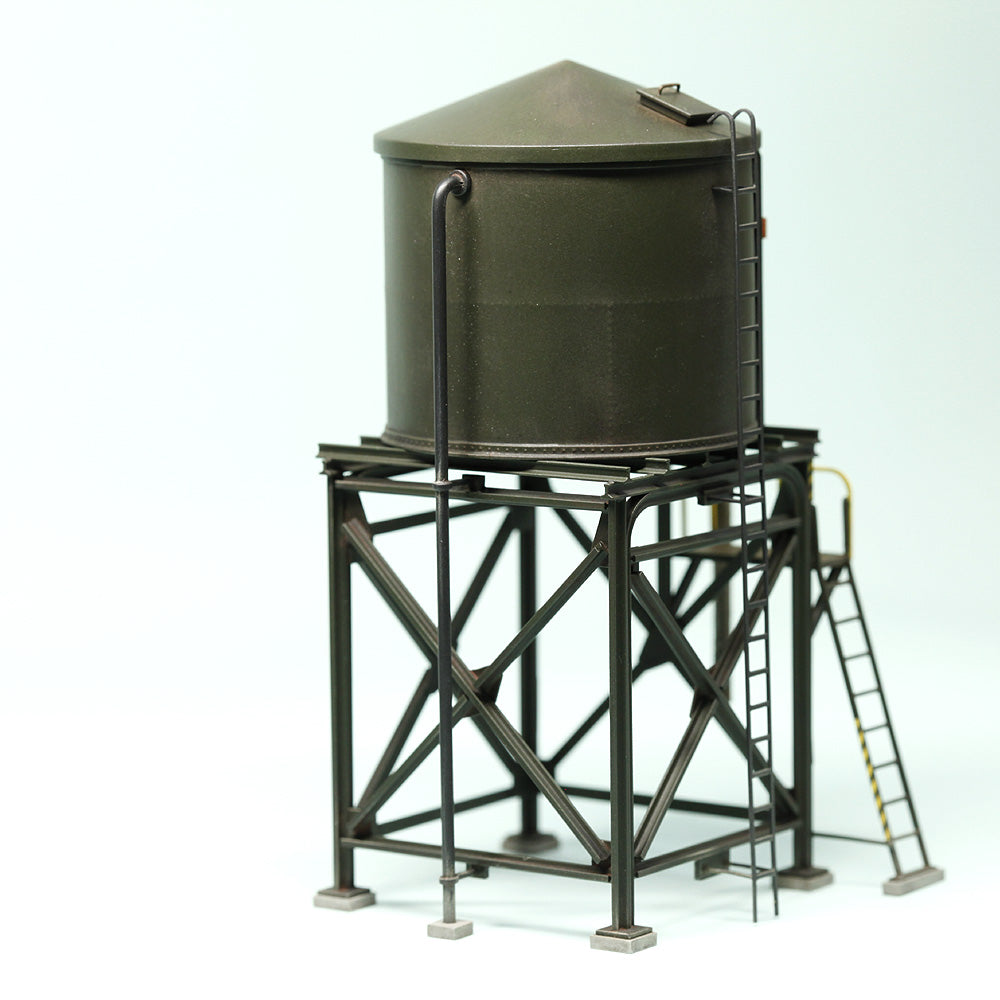 La torre de agua con depósito de agua de techo cónico sobre una torre montada sobre raíles ha sido modelada a escala 1/87 por "Kobo Nanarokuni".