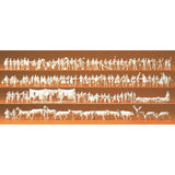 La colección incluye trabajadores ferroviarios, pasajeros, transeúntes, granjeros, lavanderos y pastores, además de animales como caballos, vacas, ciervos, ovejas y perros pastores, para un total de 120.