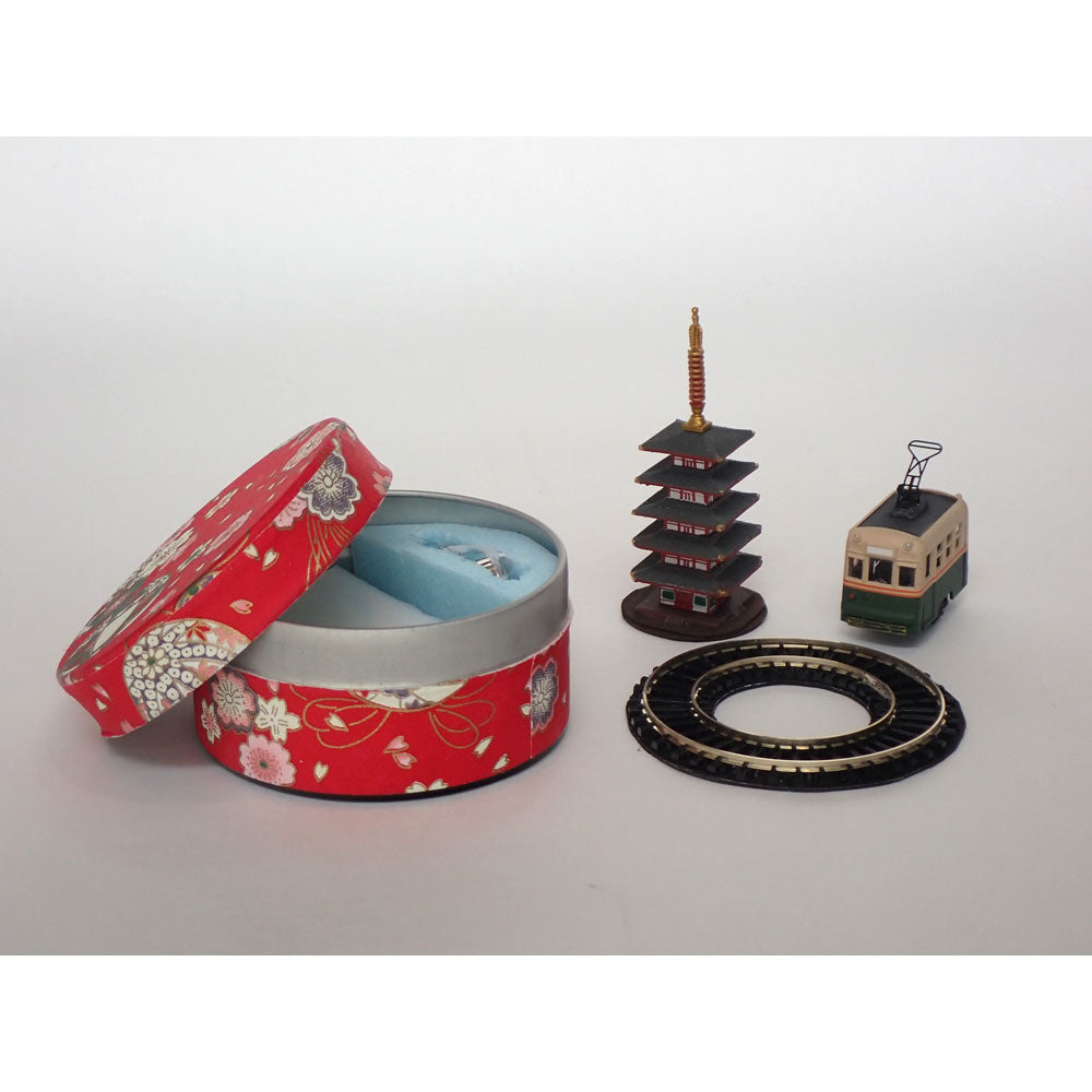 es un diseño muy pequeño que puede contener todos los rieles, edificios y material rodante en una lata cubierta con papel japonés.