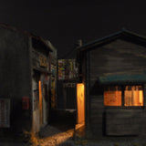Mirando hacia la calle, puedes ver el letrero del cine más adelante, y la luz se filtra por la puerta trasera de la tienda de yakitori e ilumina la calle.