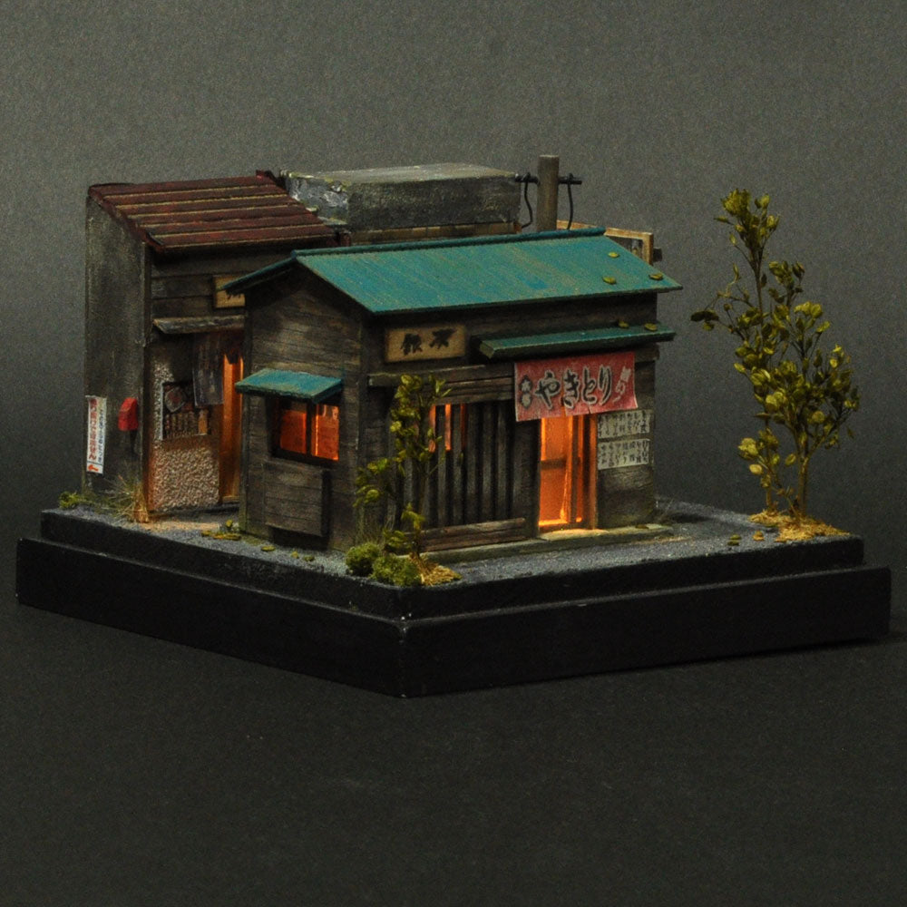 Hay un restaurante yakitori en el frente y un izakaya y un bar en la parte de atrás, los dos de atrás están deformados en profundidad.