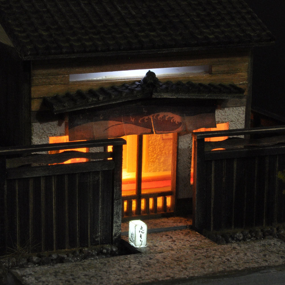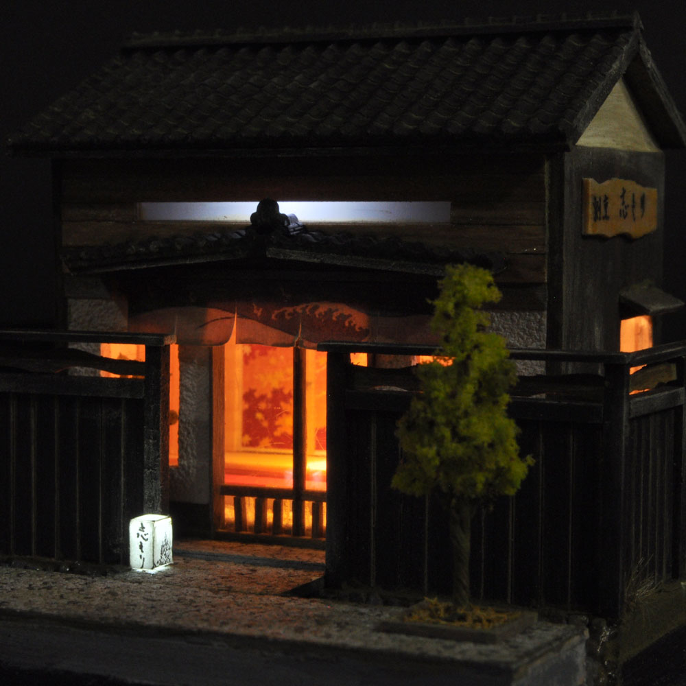 Fuera de la valla, las linternas se reflejan en el agua y, a la izquierda, se encuentra el conocido jardín tsuboniwa.