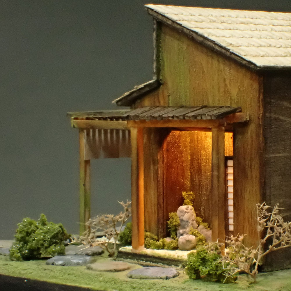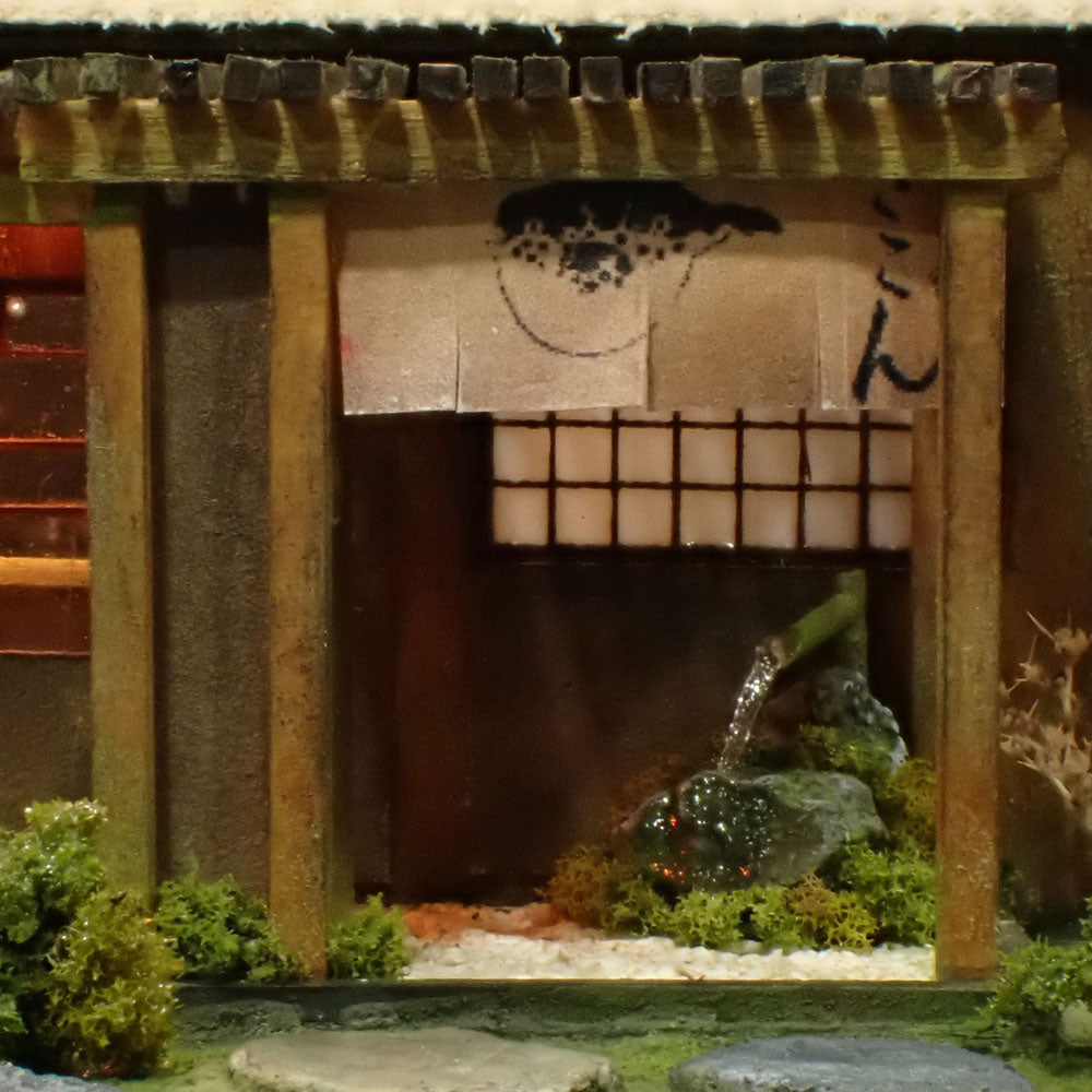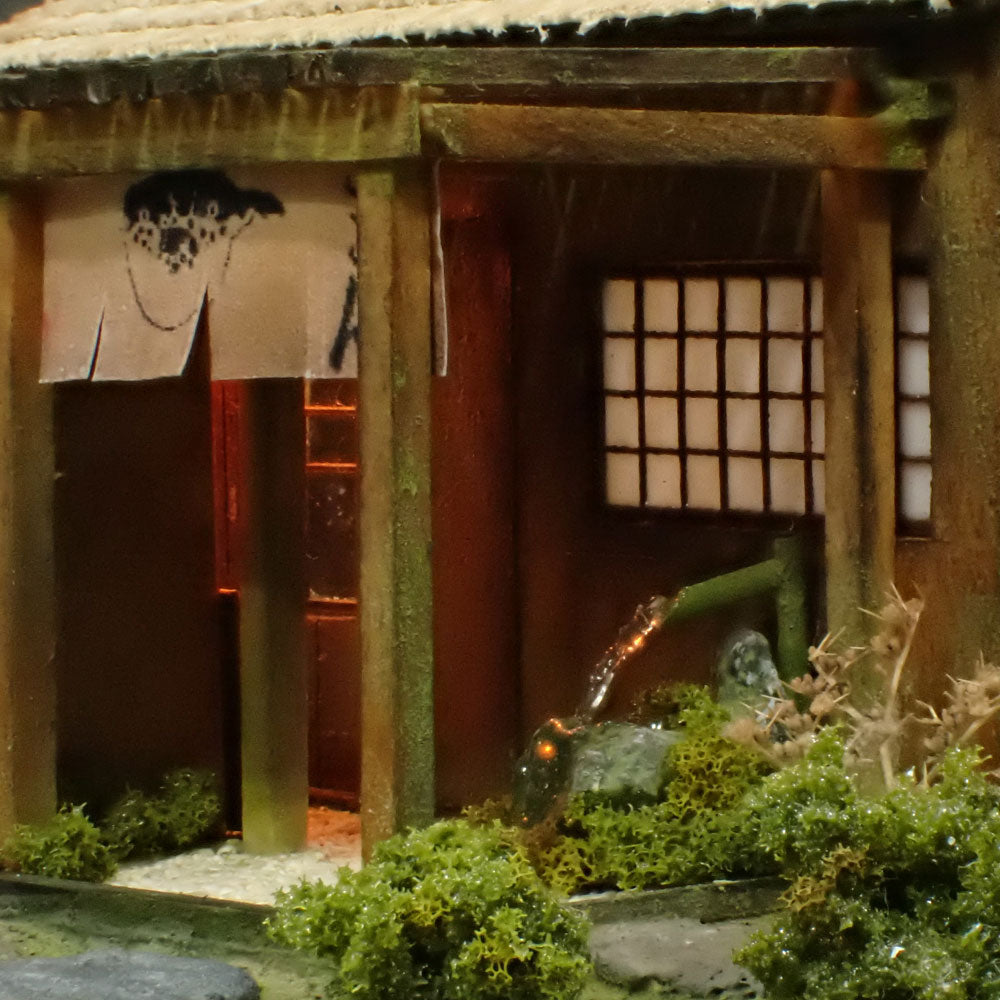 Se accede a la entrada a través de un corredor empedrado, escuchando el sonido del agua del Tesui-bachi (cuenca de agua)