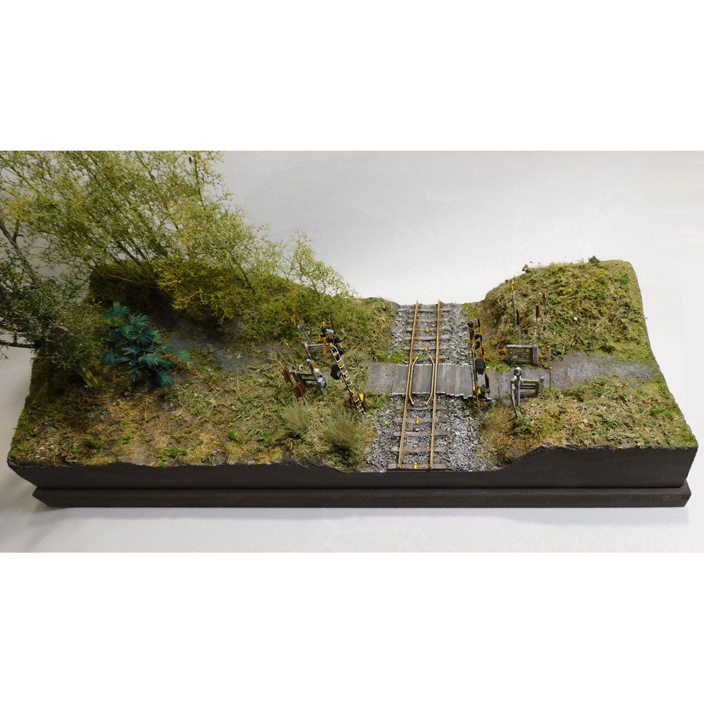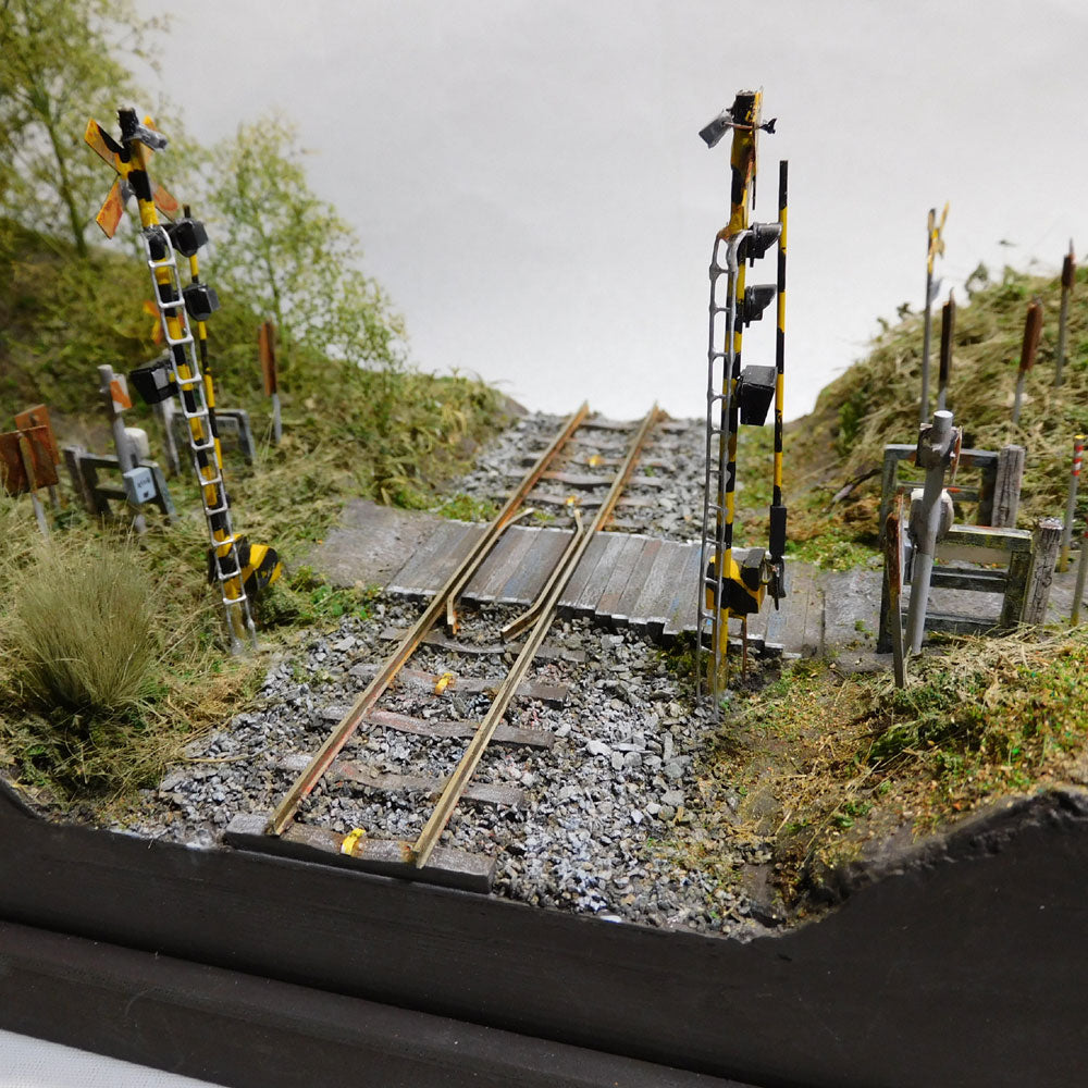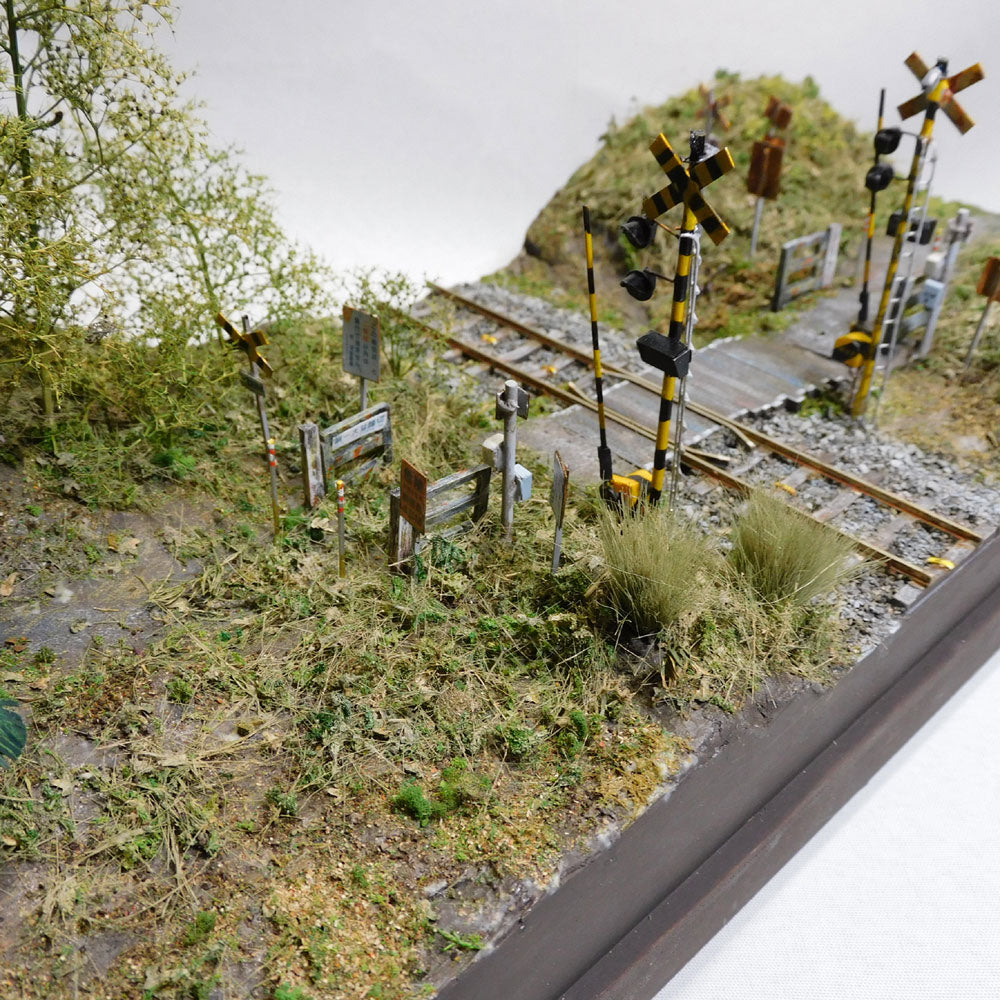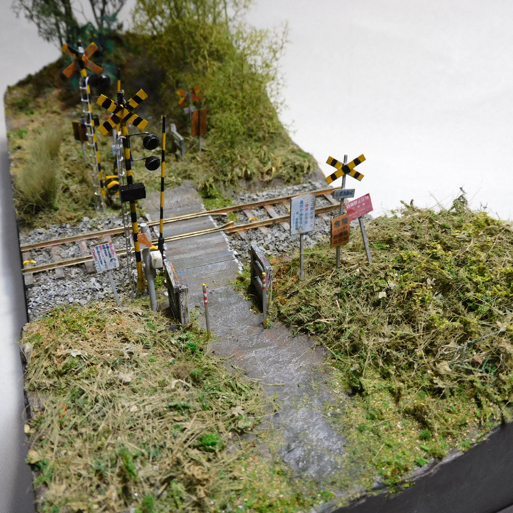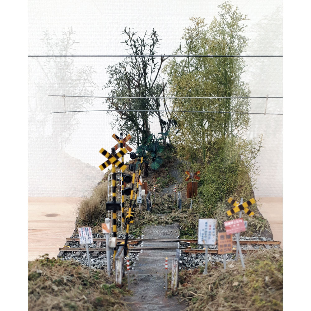 The terrain is made of polyurethane foam, the signals and various signs are made of brass wire and copper plate, and the poles are somewhat far from the crossing, so the overhead wires are glued directly to the acrylic case. The overhead wires are made of 0.5mm nickel silver wire.