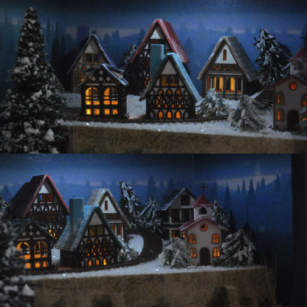 And at the flick of a switch, these little houses are lit up! The warm light spilling out of the fine windows and the cold moonlight make for a winter's night.