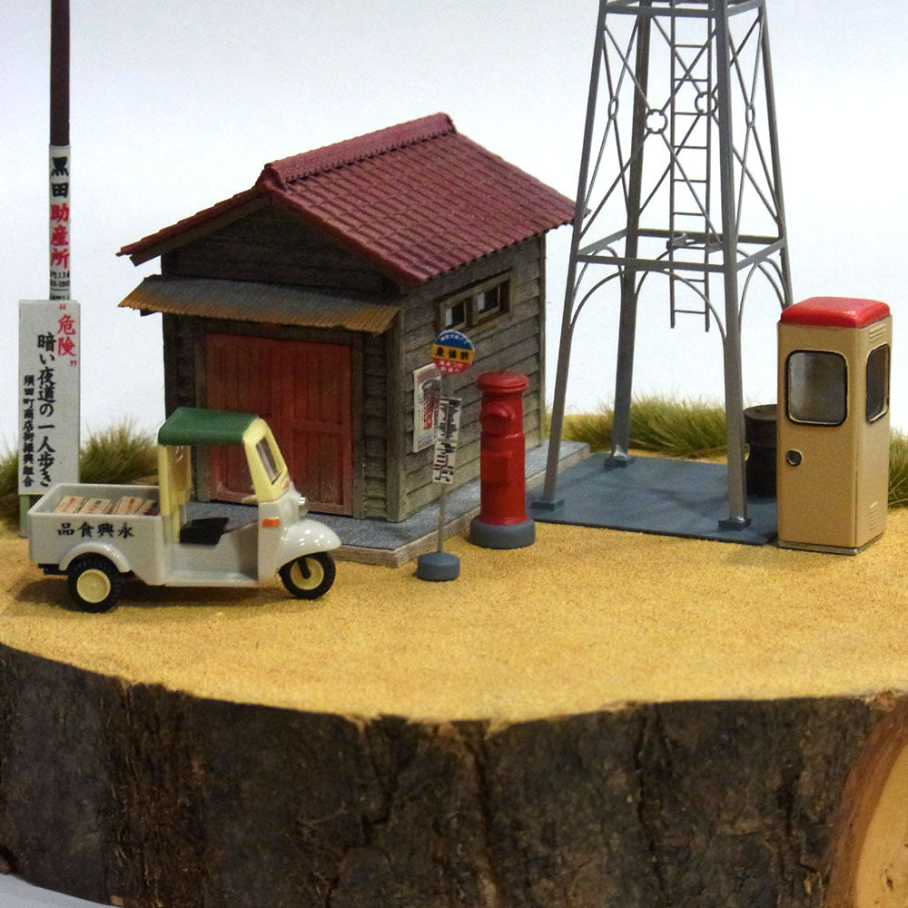 This is a diorama of the Amamiya etching kit "Fire Watching Tower" with Ito's original fire fighting warehouse and bus stop.