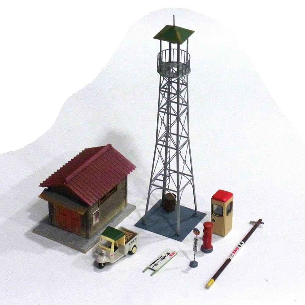 Scene parts (complete set): fire lookout tower, fire warehouse, telephone pole, telephone box, bus stop, signboard, post box, early midget (with load)