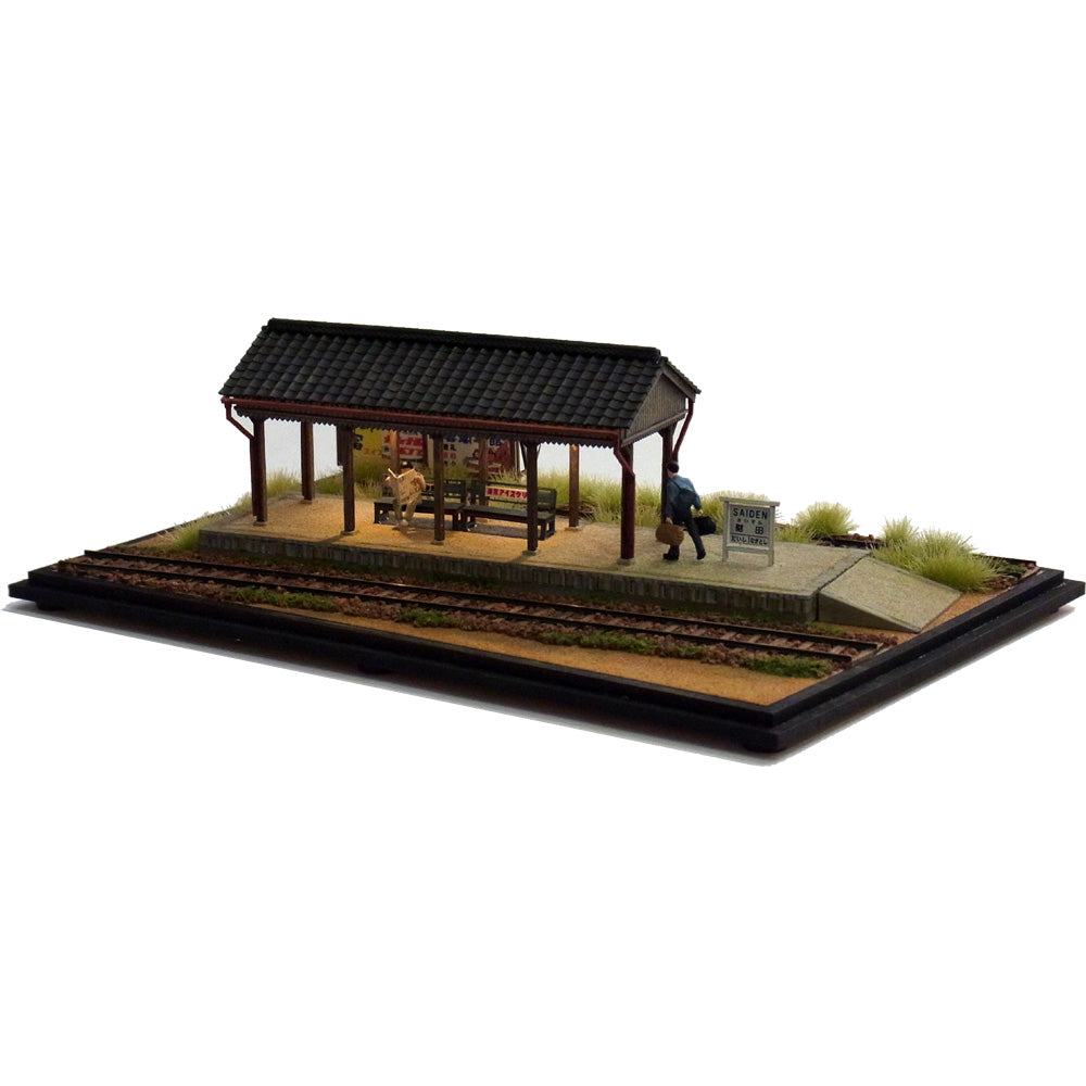 The prototype is Saiden Station of the Saidaiji Railway, but this work represents the imaginary world of Saiden Station, a little past the glamorous days of light rail service. One side of the island platform has not been used for a long time, and the grass is overgrown. A sign for a local inn can be seen beyond the disused track.