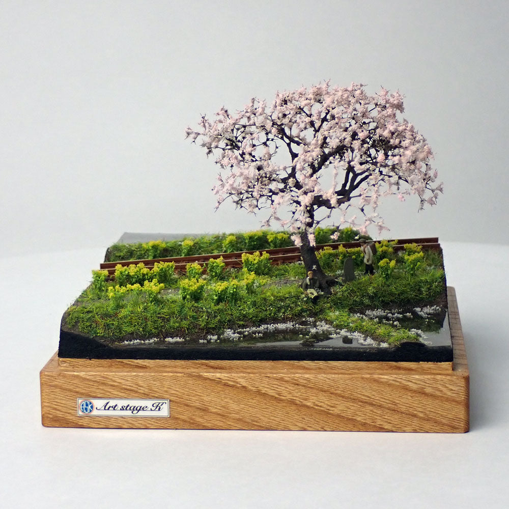 A spring scene is created on a solid Japanese zelkova wood foundation. Field mustards are blooming around the rice paddies that have finished raking, and the cherry trees overhead are in full bloom.