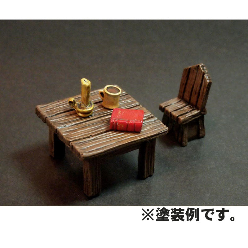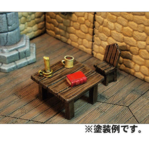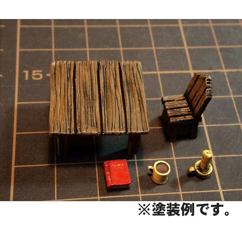 The set includes a desk, a chair, a candlestick, a book and a cup, and is ideal for use with character figures.