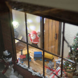 A warm room with a decorated tree and piles of presents. On the floor there is a toy train, and you can hear the joy of children.
