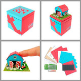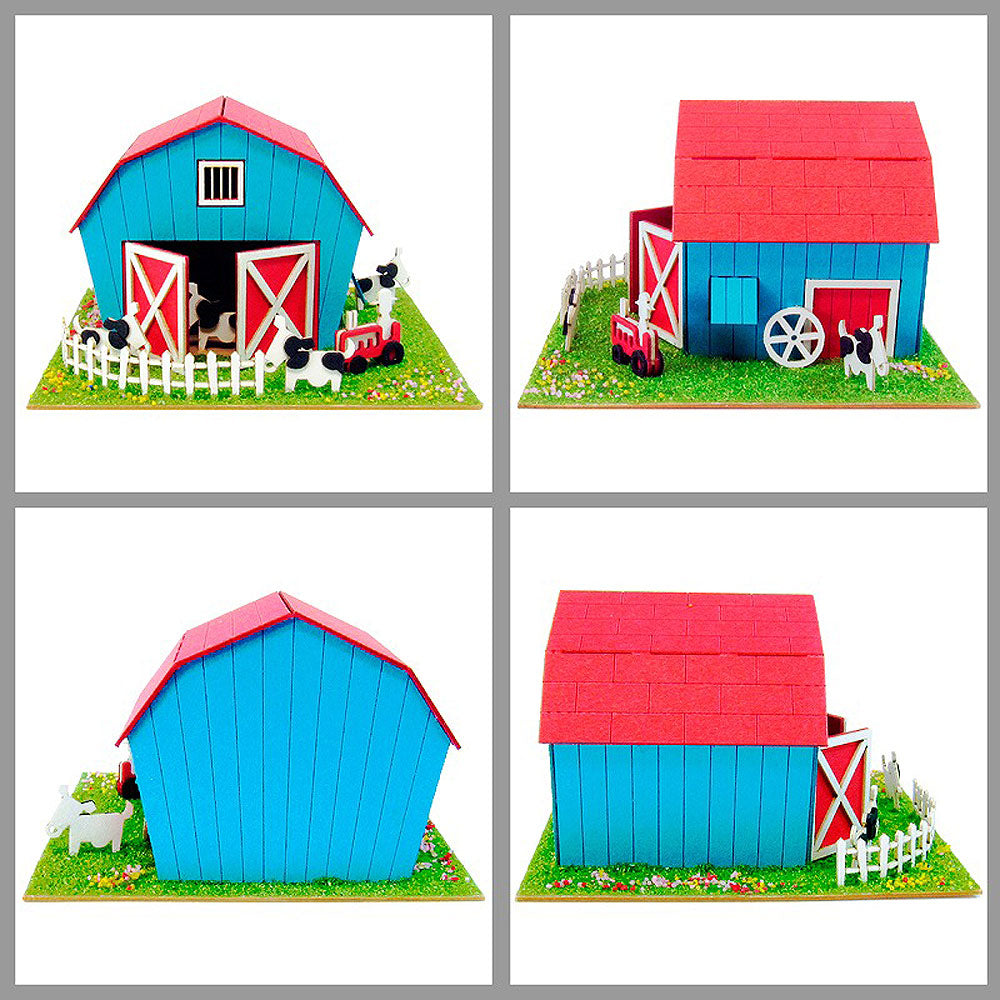 The farm has a bright blue exterior and a red roof, and is somewhat of an American farm.
