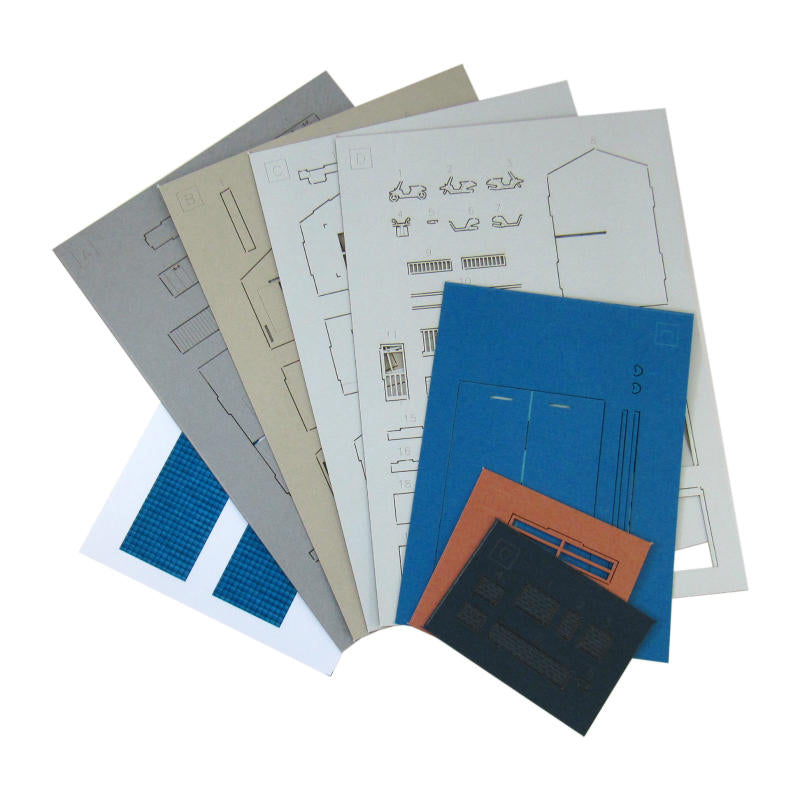 Contents: Laser sheet A-G (7 sheets), Roof sheet (1 sheet), Plastic sheet (1 sheet), Assembly instructions