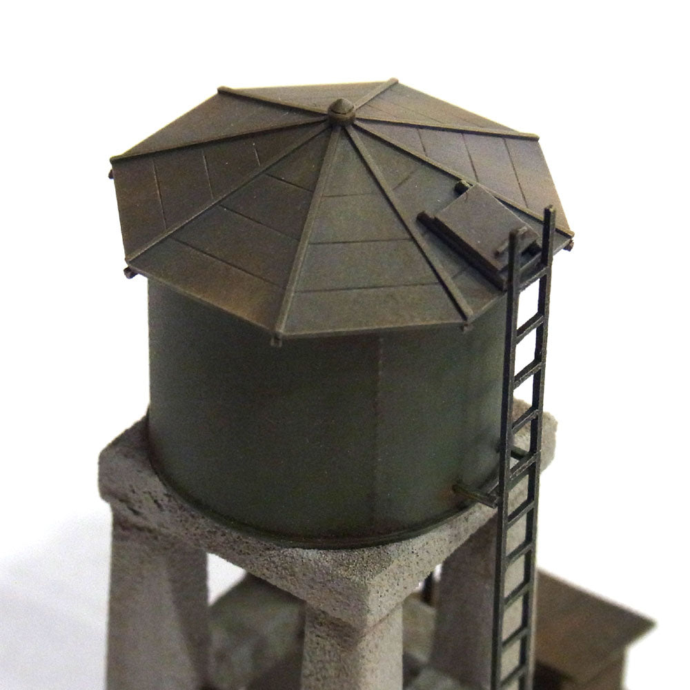 Both the spout and the tank are fully scratch-built. The shingle roof, the riveted body, the ladder, the tapered concrete legs... all have a clean, unobtrusive appearance and the weathering gives them a distinguished appearance.