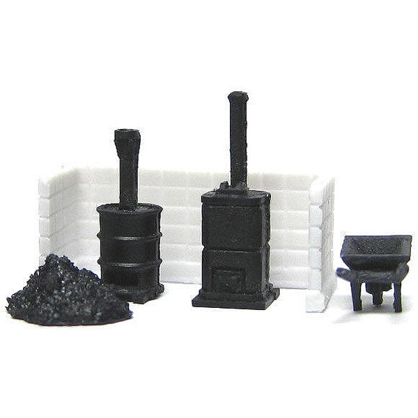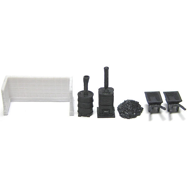 The model is made of black (incinerator, ashes, one wheeled vehicle) and grey (block wall) coloured resin, so it can be enjoyed unpainted.