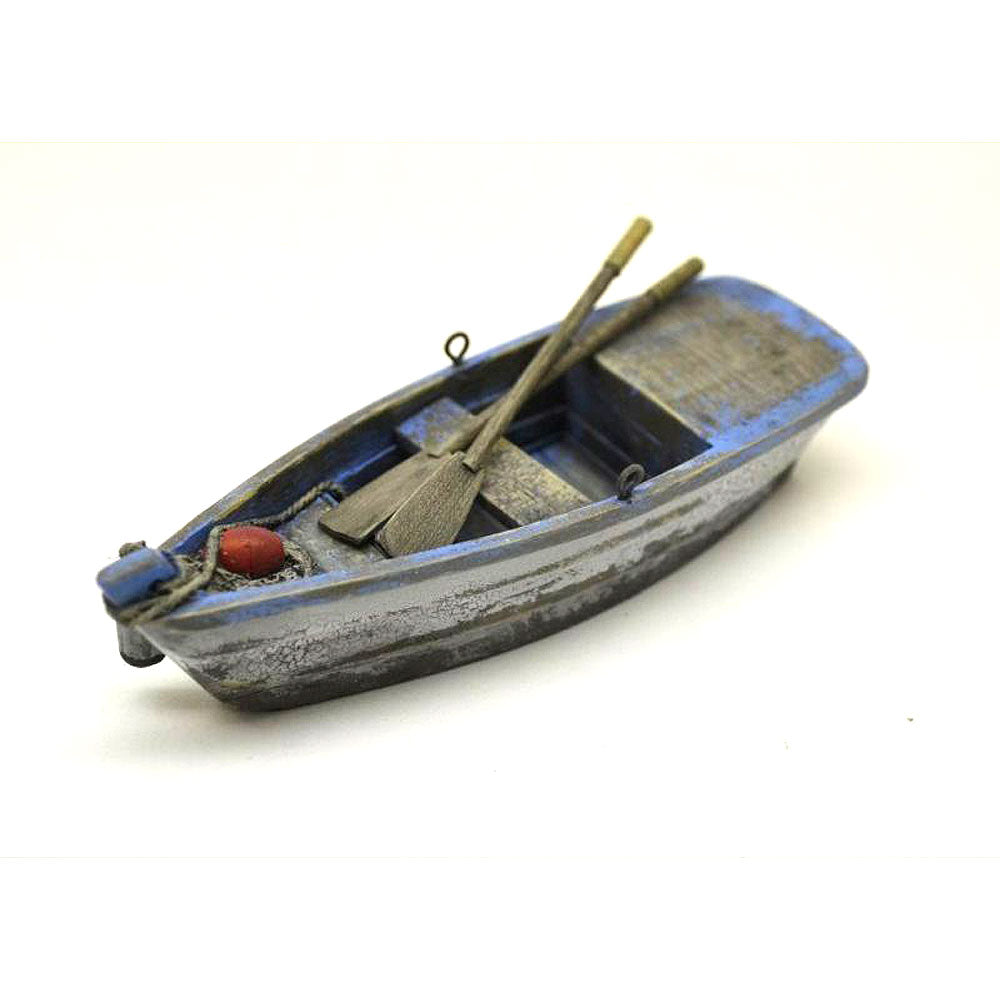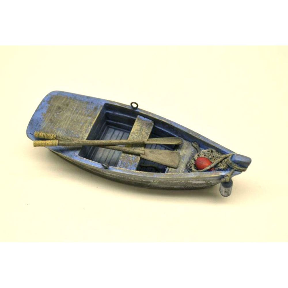 The boat has the grain and style of a wooden boat, but also comes with nets, floats, oars, hooks for anchoring to barges, pre-cut metal parts and rope!