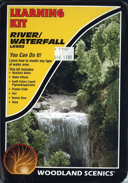The kit contains the ground colour, water material, water colouring agent, plaster cloth, gravel, grass material and glue needed to build the river and waterfall.