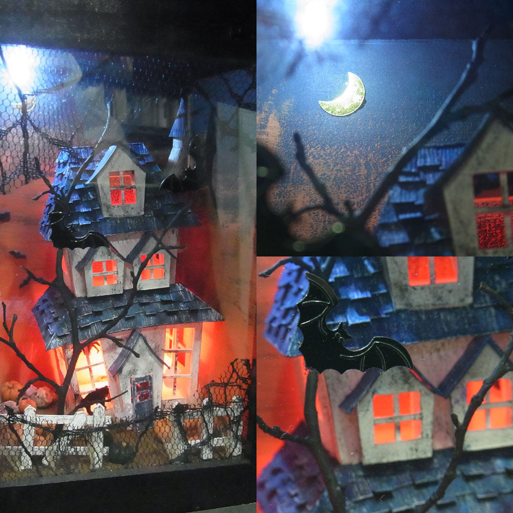 Jack-o'-lanterns (pumpkin heads) are strewn about the garden where the black cat plays. The front door of a blue-roofed chimney house, eerily lit by a crescent moon, opens to reveal a ghost inside...