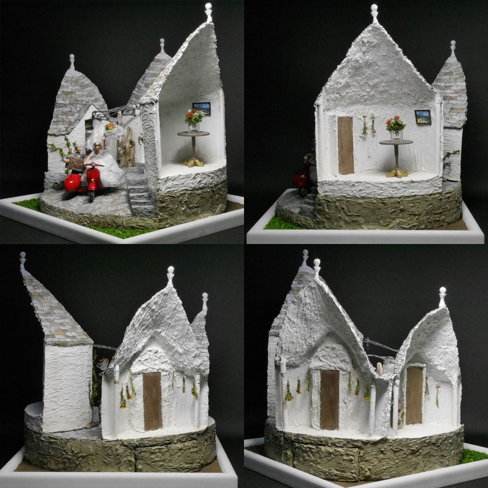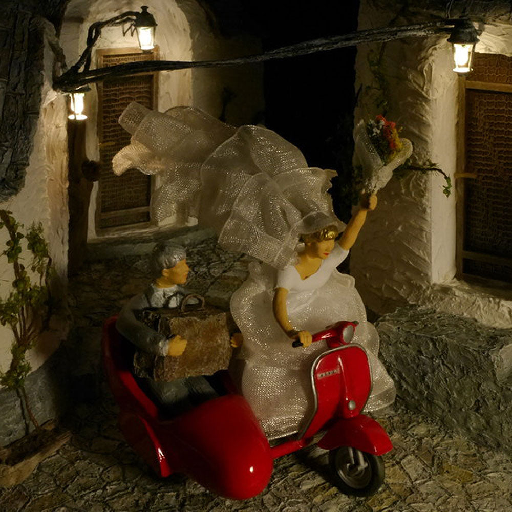 It represents a scene of a bride on a Vespa and a groom in a sidecar riding fast between buildings called Trulli in the Alberobello region of Italy.