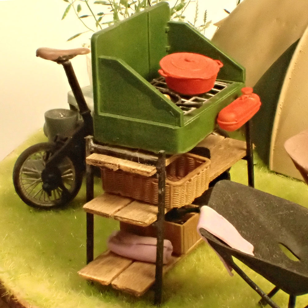 The tent is made with 3D and epoxy putty, referring to the Coleman tent. The rope is made of 0.2mm wire twisted and pegged with 0.3mm brass.