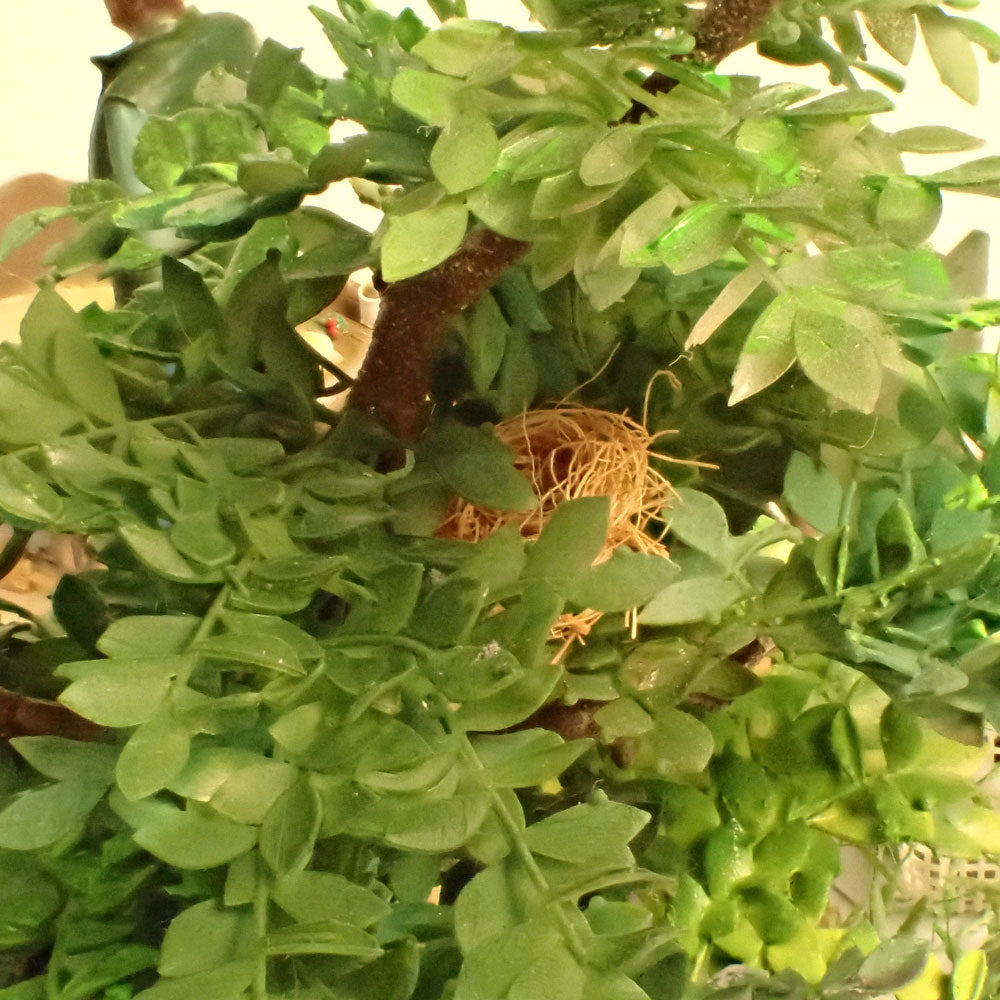 On the low table there is coffee and a fried egg bread made from resin clay.