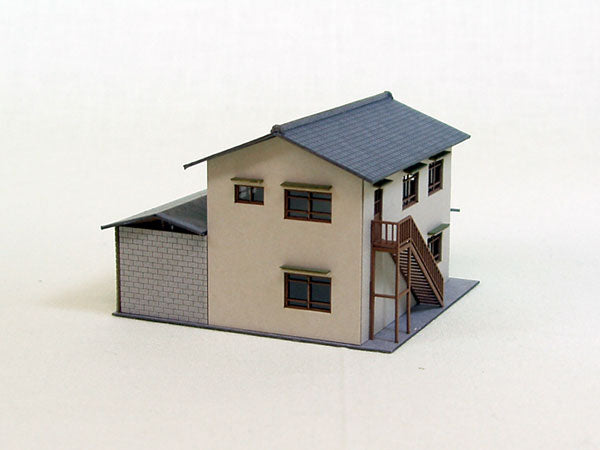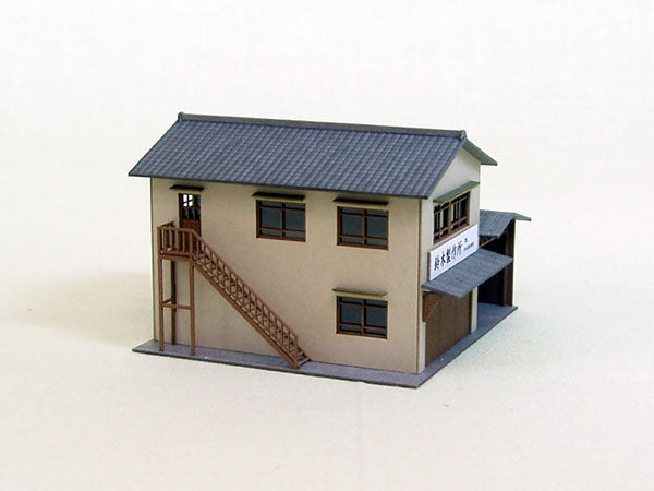 这是一家小镇工厂,一楼有一个封闭的车间,外部楼梯上有一个办公室。