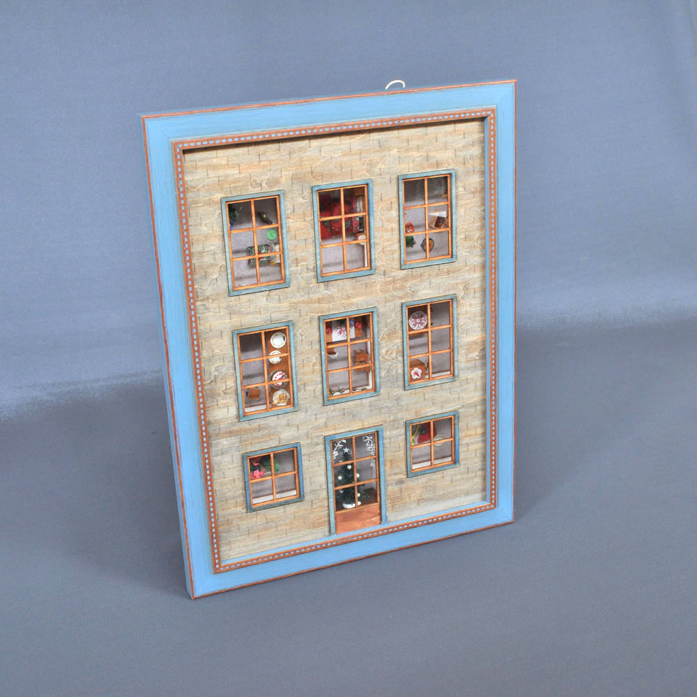 这一系列带框的小立体模型描绘了一个带有“Kamineko”的场景。