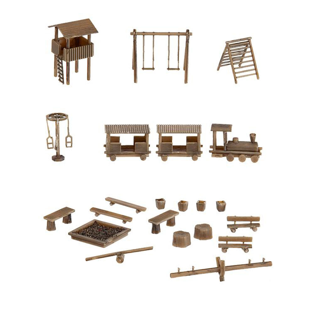 套装包括:桌子和长凳、梯子、跷跷板、秋千、冒险屋、沙坑、火车游乐设备等。