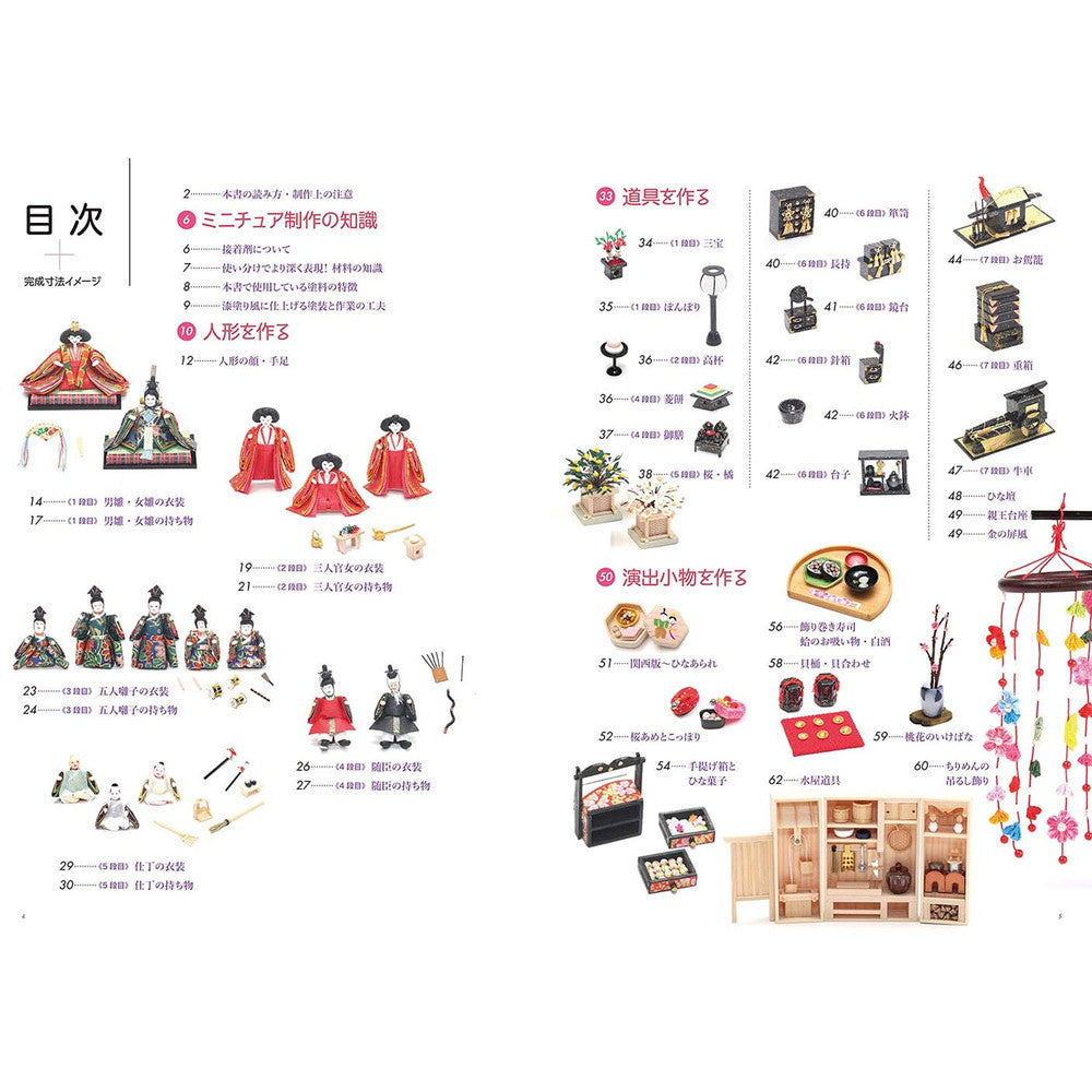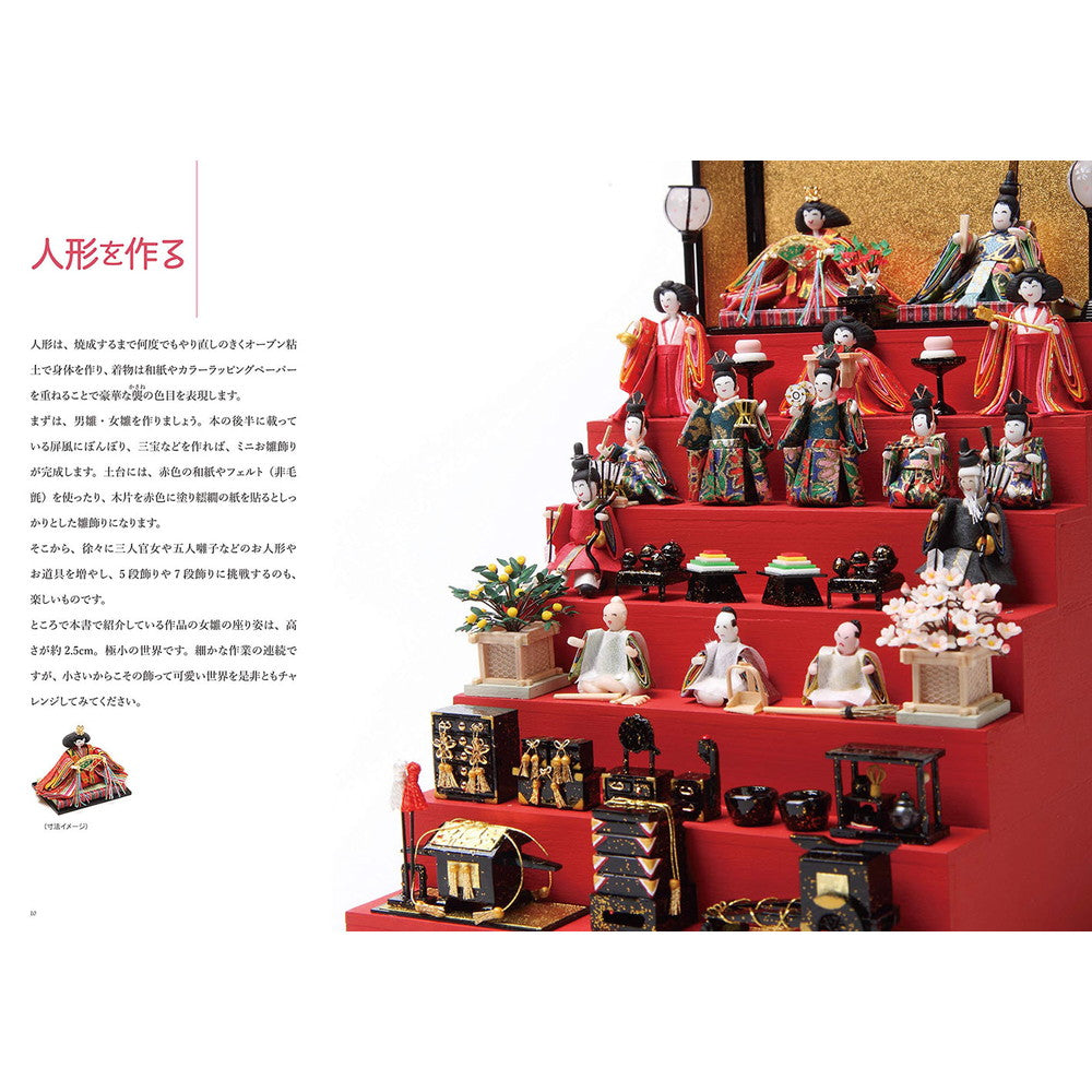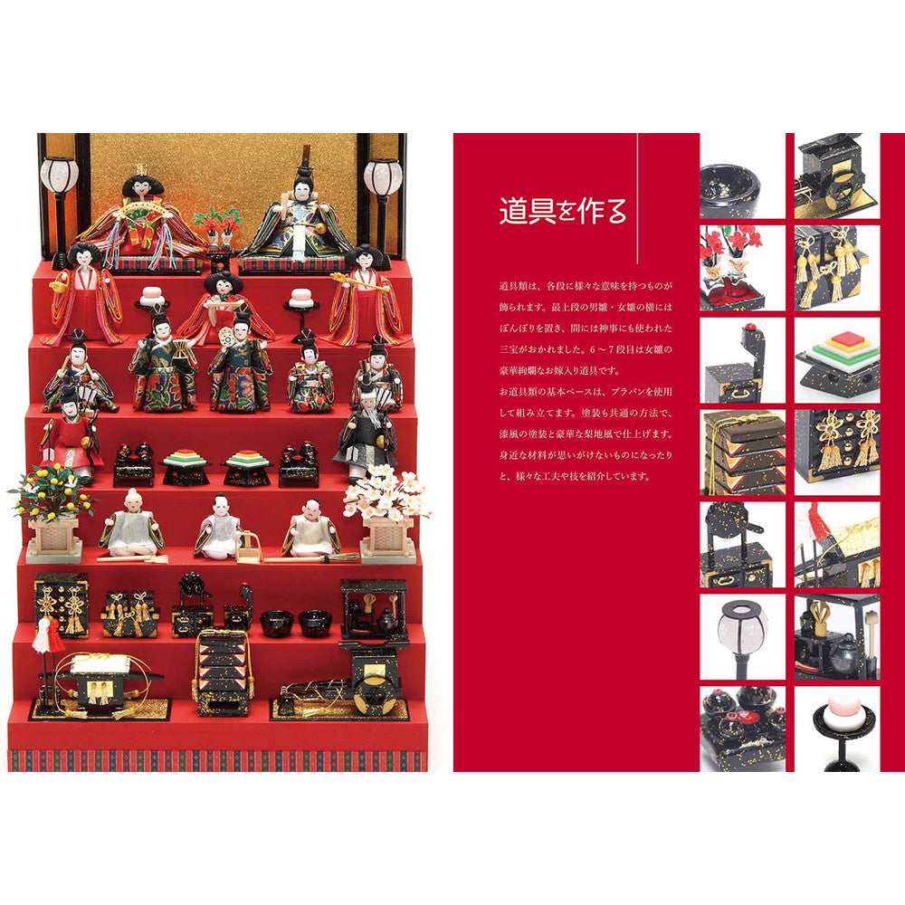 provides detailed illustrations and photographs of how to make miniature accessories, dolls, and classic props to decorate the Hinamatsuri Festival.