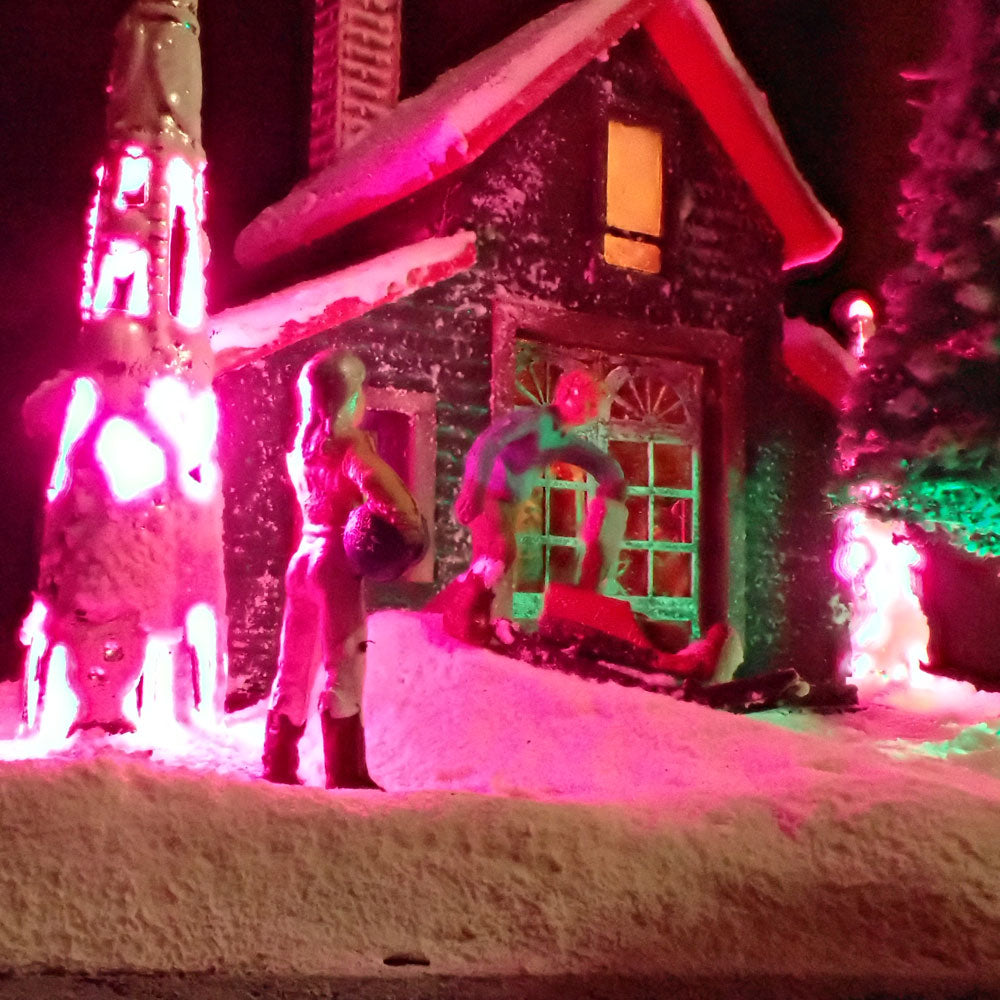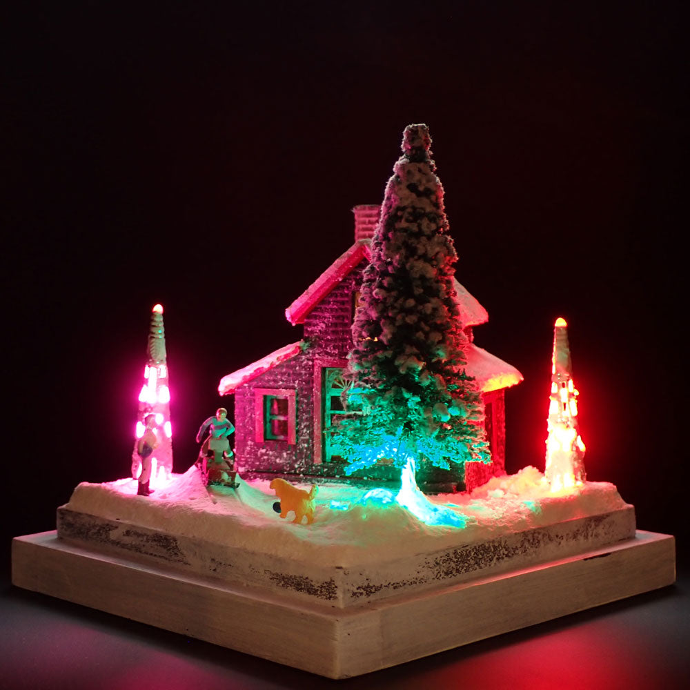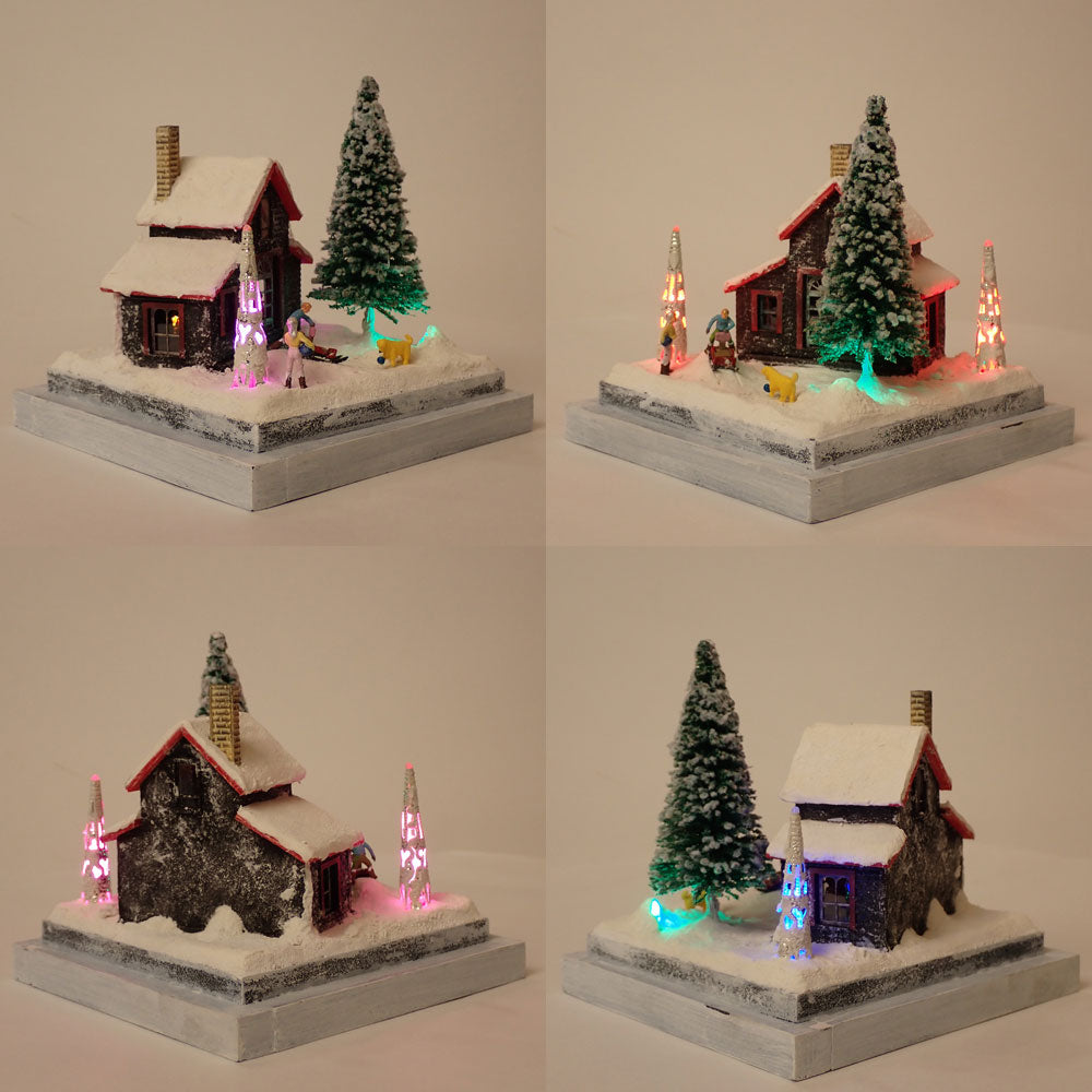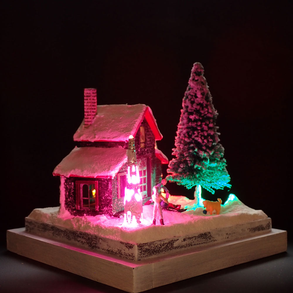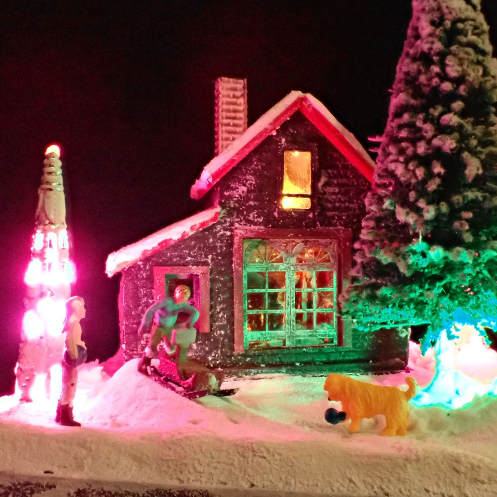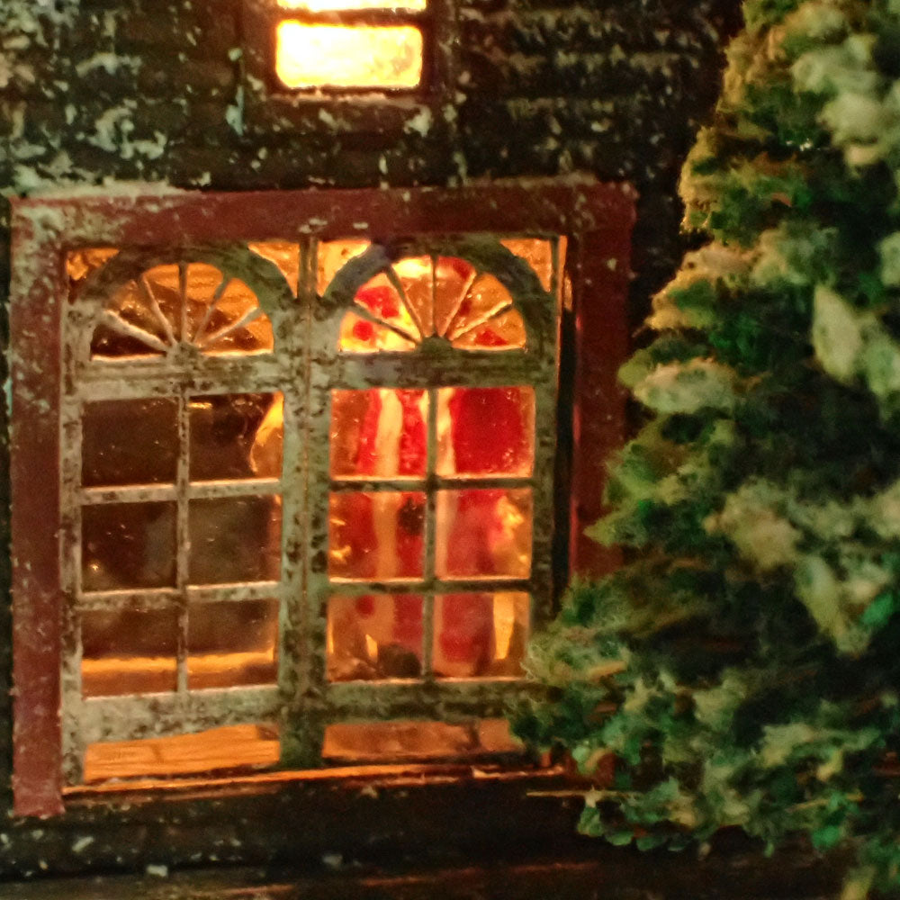 圣树后面是圣诞老人的房子,有一个尖尖的两层屋顶。