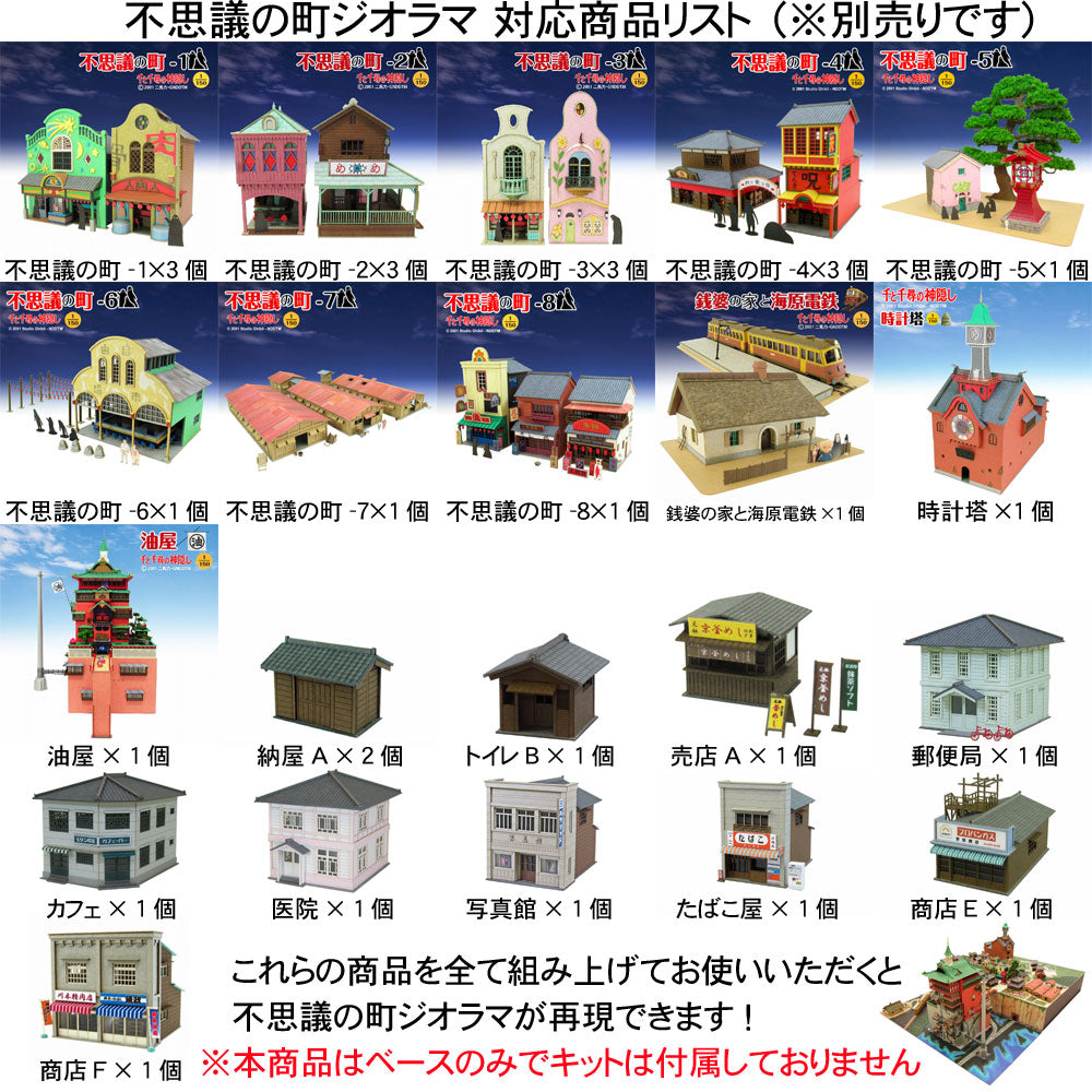 This large diorama base allows you to enjoy recreating the entire town of wonders using a series of 11 paper assembly kits and 10 original Sankei kits that reproduce the buildings in the play "Spirited Away".