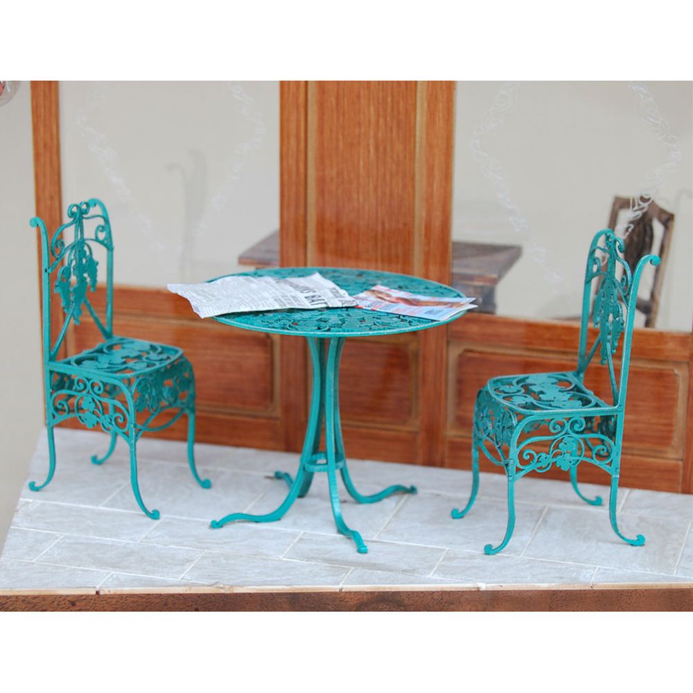 A realistic 1/12 scale reproduction of a caf? table and chure made of roto-iron (wrought iron).