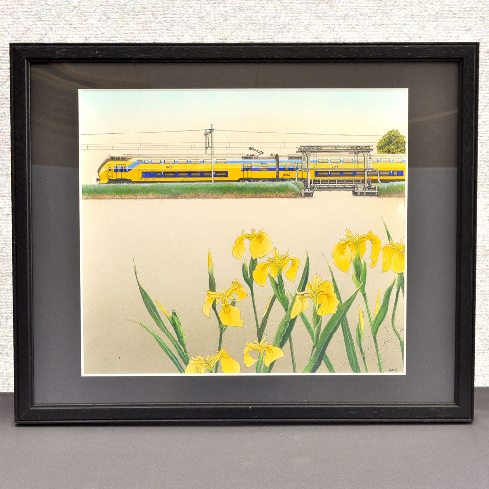 The subject is a special speed train 'Regiorunner' running on the track between the canals and the iris flowers, common in Europe, on the opposite bank.