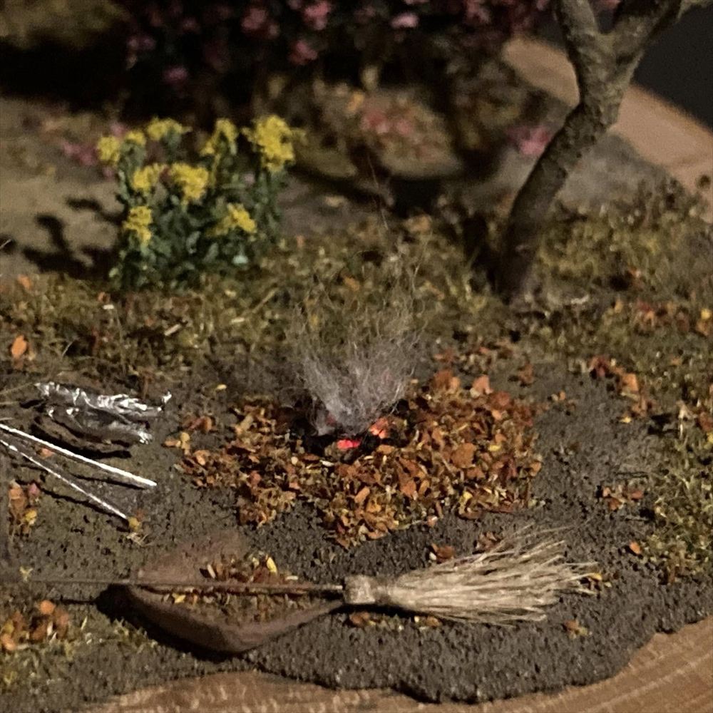 The fire is pre-decorated with electric lights. There is a coin cell battery (CR2032) power supply on the bottom of the work and the switch can be operated.