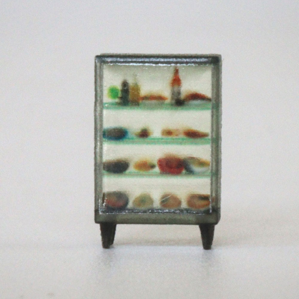 Curry, ramen noodles, rice bowls, bottled beer, etc., sculpted in three dimensions, are embedded in a glass case filled with transparent resin.