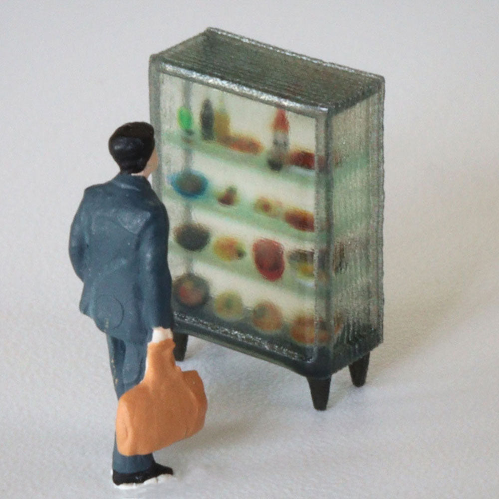 3D modeled curry, ramen noodles, rice bowls, bottled beer, etc. are embedded in a glass case filled with transparent resin.