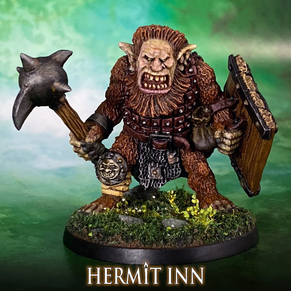 Equipped with a huge mace and wooden shield, Bugbear wears a chainmail with heavy reinforcing plates, similar to the masterpiece, and has a rough and rugged appearance. The lamellar armor and flying tacks emphasize the sense of wear and tear. The weapons and equipment are unique, and the shield is made of thick wood with iron added for a heavy weight. 40mm base is included, allowing for powerful poses.