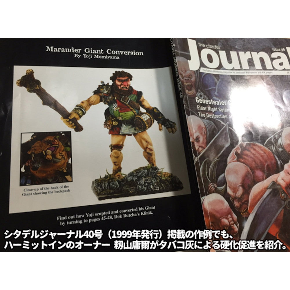 Tobacco ashes have been utilized as a curing accelerator for instant adhesives since ancient times. Tobacco ashes are completely burned in a high-temperature gas burner, strained many times, and packed in a 70 ml Tupperware container. Since it is completely burned and impurities are removed as much as possible, there is no tobacco odor.