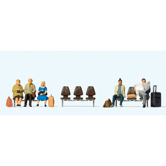 五名旅客坐在长椅上等待出发:Preiser,完成画作 HO(1:87) 10660