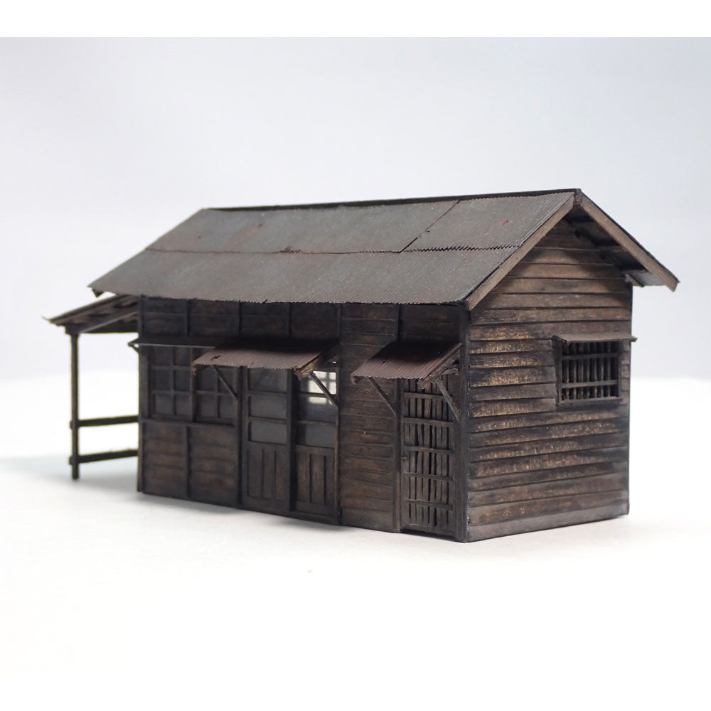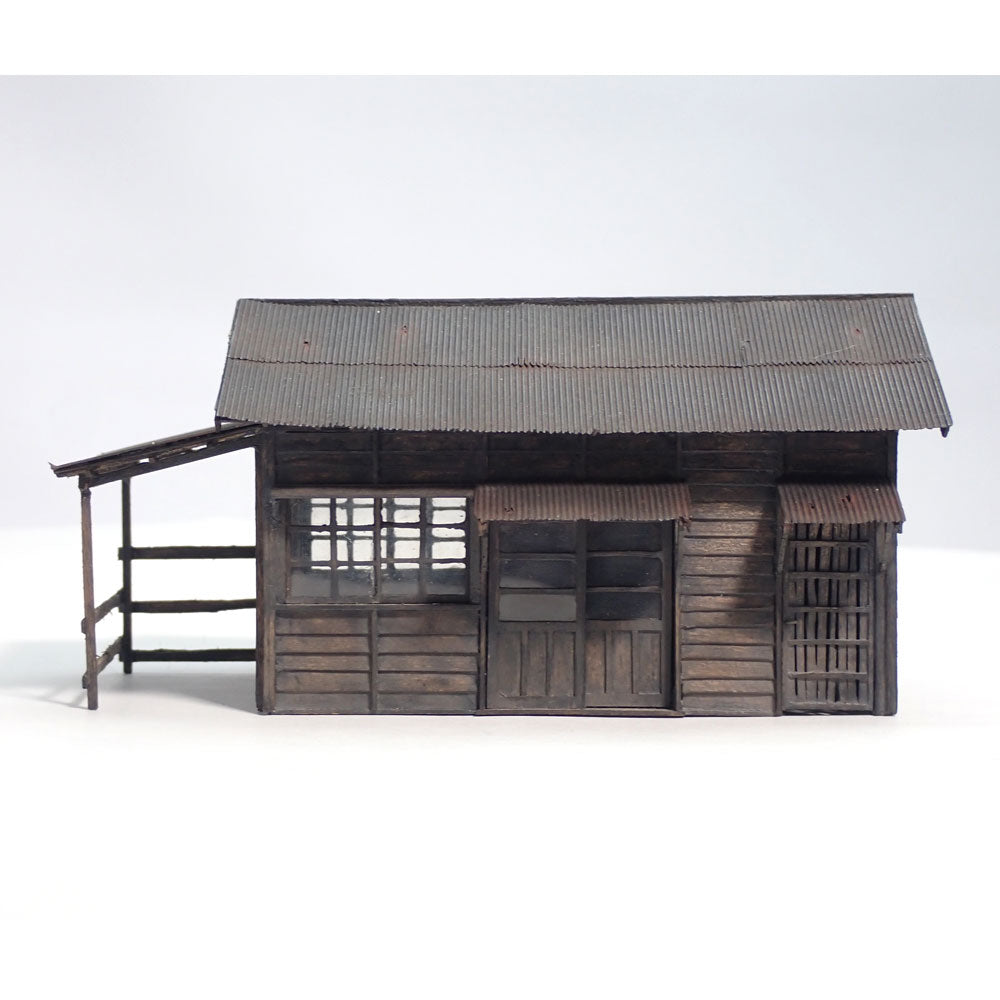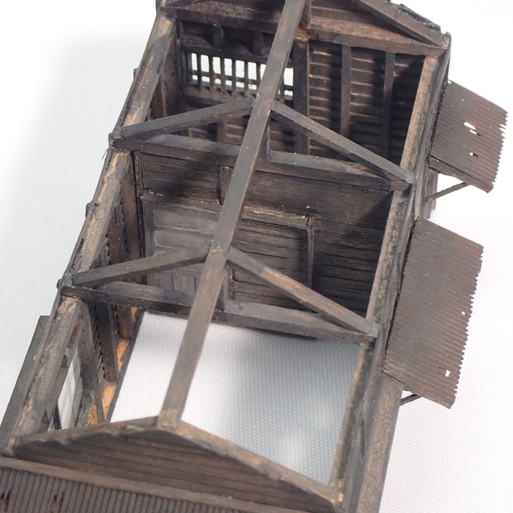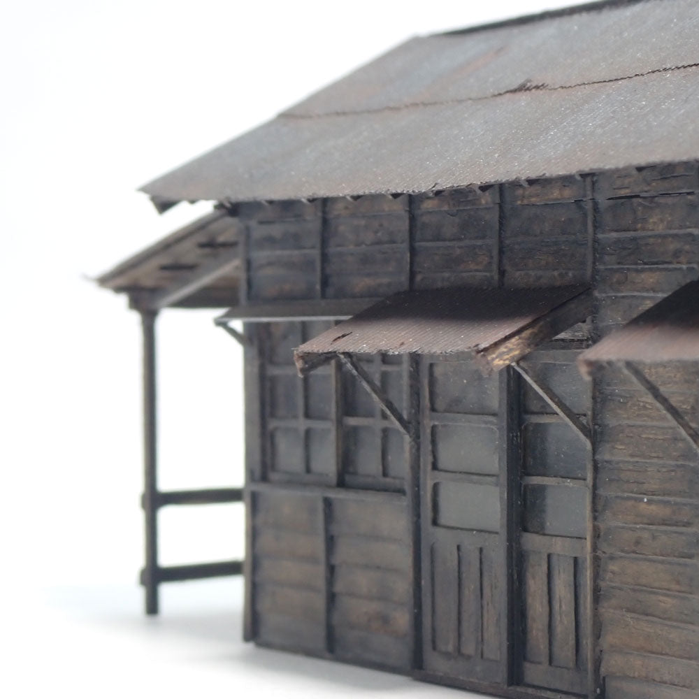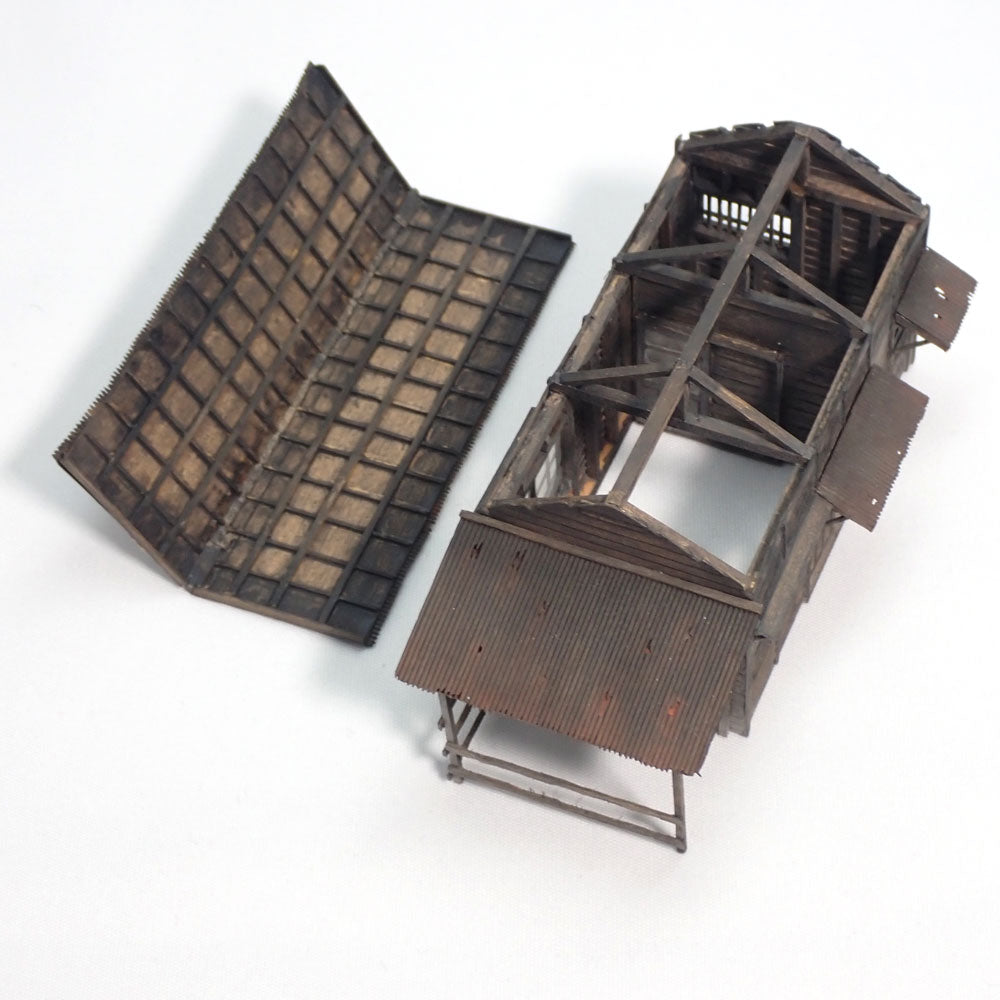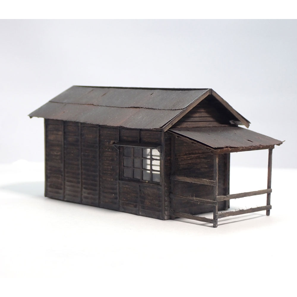 Like the real thing, the walls are planked one by one, with light leaking in through the slightest gaps, and the interior with the roof open is very realistic. The rusted tin roof is beginning to show holes, and the blackened stains on the board walls, which look as if they have been smoked in, give the impression of the years this hut has spent.
