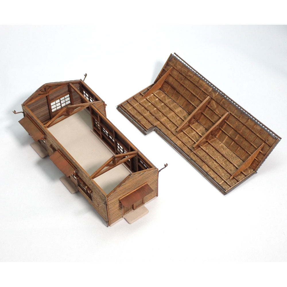 The weathering is sufficient to show the age of the model, while still allowing it to be used as an active model. The model's density is unmatched, with details such as rain gutters. The roof is removable and the interior can be built in.
