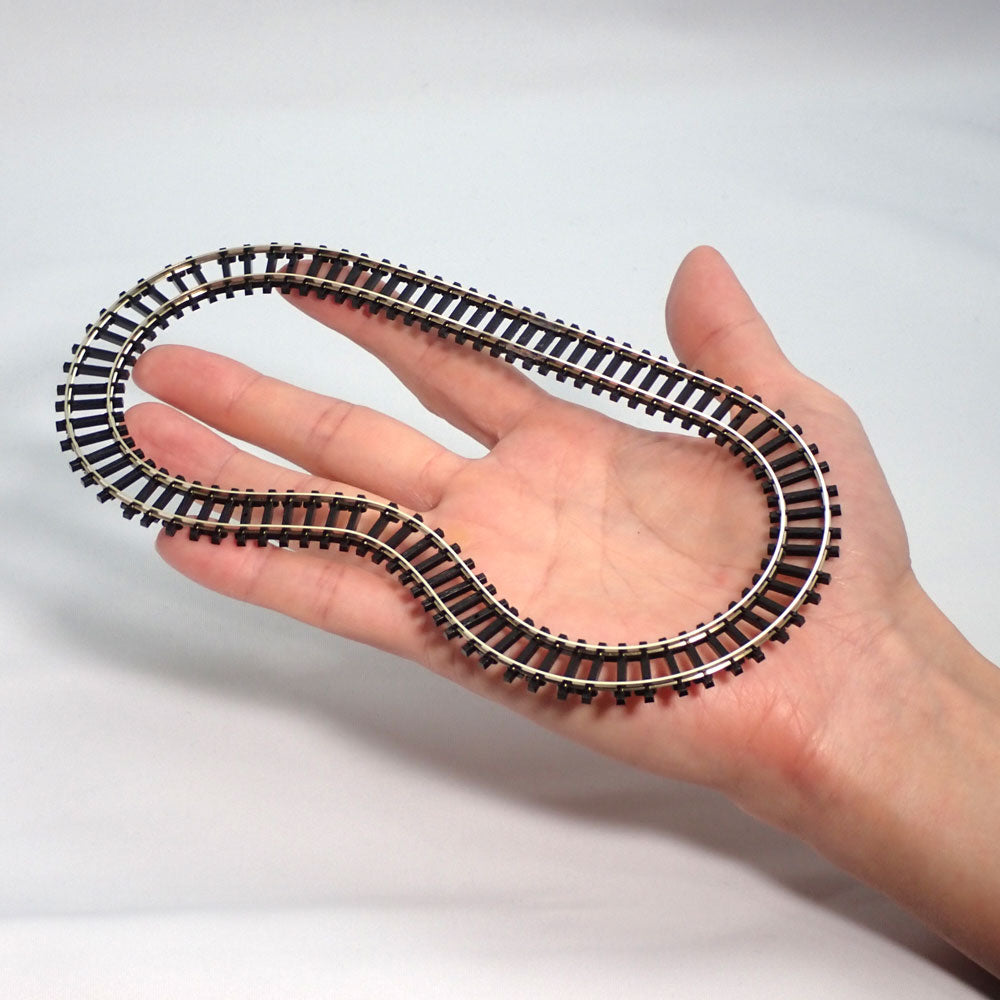 The flexible rail was bent by Mr. Ishikawa himself into a very small deformed oval rail.