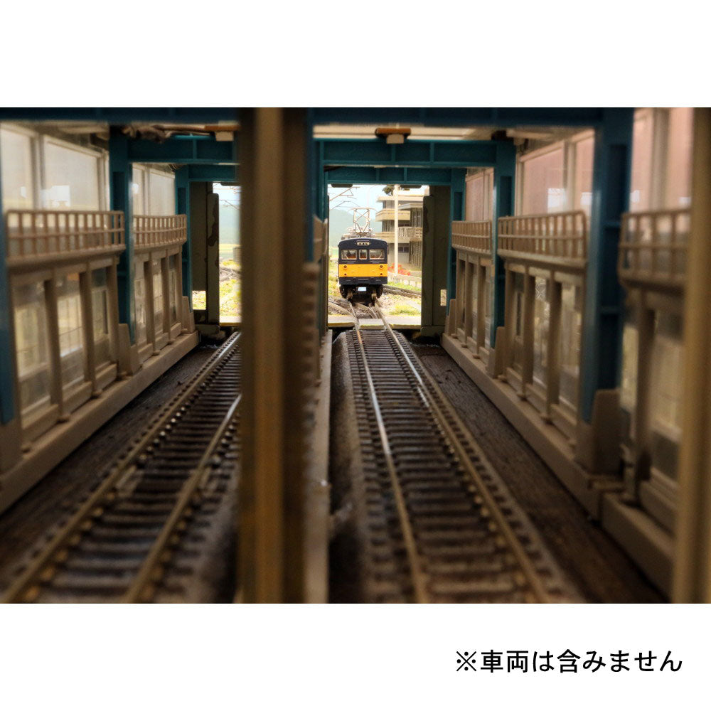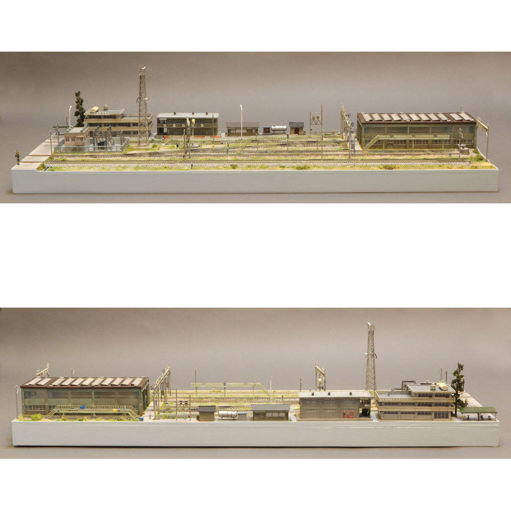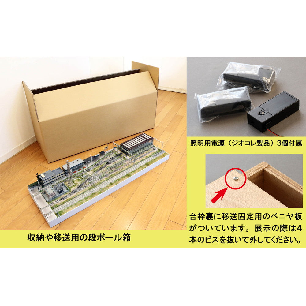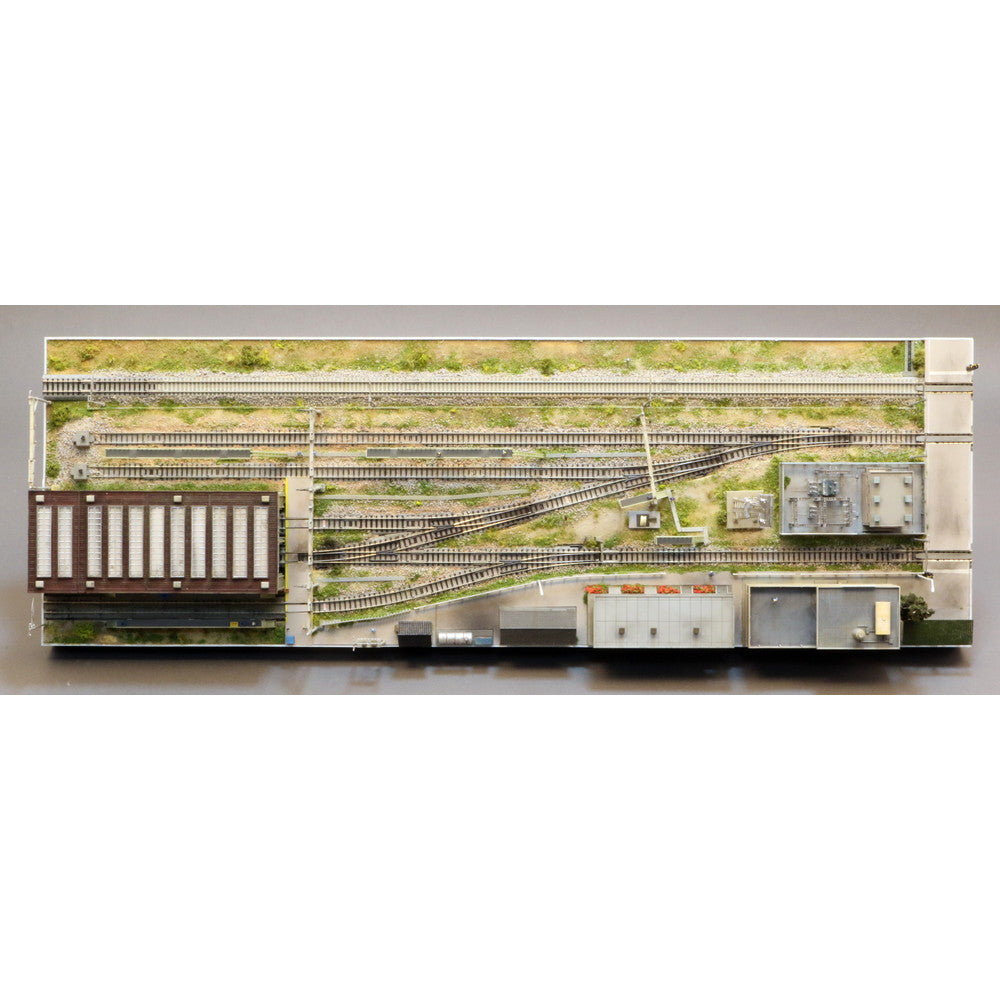 这是一个以车辆仓库为主题的风景模型,专为 N 规格车辆展示而设计。五个点(道岔)被合并到最多六行轨道中,形成了典型的铁路车站的复杂布线。该模型还融合了铁路堆场的各种元素,例如检查棚、清洗线和带有检查平台的滞留线,这些细节也是模型的一个亮点。架空电线杆也排成一列,可以作为火车和电力机车的基地。